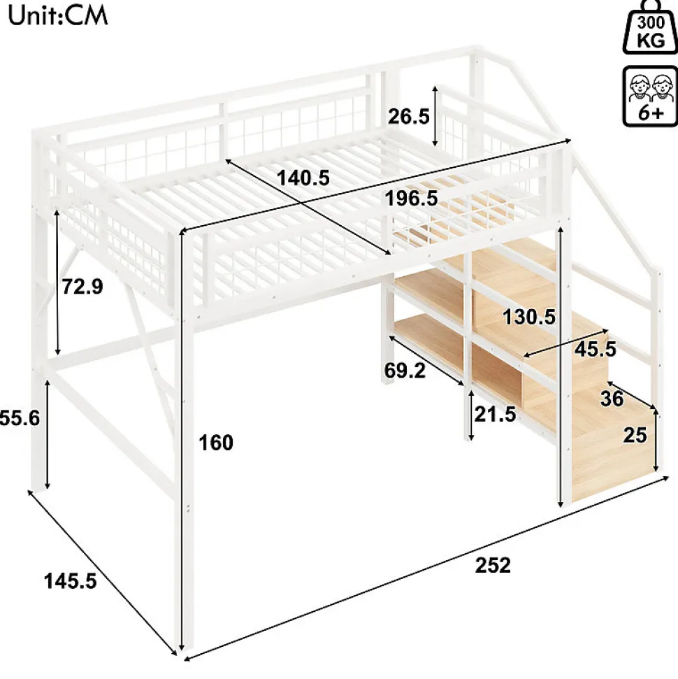 Spécifications● Couleurs du produit : Blanc● Dimension du produit : 252×145.5x160cm● Matériau du produit : Métal + MDF● Poids du produit : 68kg● Capacité de charge : 300kg● Épaisseur recommandée du matelas : 10cm(Matelas non inclus)● Montage requis : Oui● Nombre de colis : 3Attentions● Ce produit est divisé en 3 colis pour la livraison. Il se peut qu’ils n’arrivent pas en même temps. Merci d’attendre patiemment.● La livraison comprend un cadre de lit, un sommier à lattes. Le matelas n’est pas compris dans la livraison.● Si vous avez des questions pendant l’installation, veuillez nous contacter dès que possible.● Remarque importante : en raison de la taille importante de cet article, il est possible qu’il soit expédié en plusieurs colis. Les colis peuvent arriver séparément. Veuillez vérifier si vous avez reçu un e-mail contenant plusieurs numéros de suivi après avoir reçu la notification d’expédition afin de pouvoir suivre la livraison de chaque colis.