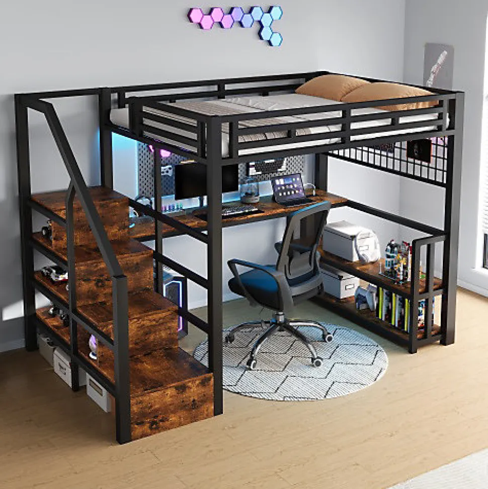 •【Un choix robuste】Une combinaison astucieuse d’une structure en métal et de panneaux de fibres de moyenne densité (MDF). La structure métallique durable assure un soutien stable au cadre de lit ; le MDF est inodore, préservant ainsi la santé de votre enfant.•【Un rangement organisé】Des étagères et des barres de suspension judicieusement intégrées permettent de ranger facilement les livres, peluches, petits sacs à dos et autres objets fréquemment utilisés. La conception à plusieurs niveaux optimise l’espace vertical et améliore l’organisation de la chambre.•【Un éclairage intelligent et apaisant】Les bandes lumineuses LED intégrées permettent de régler la couleur et la luminosité via une application. Un éclairage doux crée une ambiance apaisante, idéale pour favoriser un endormissement paisible.•【Recharge pratique】Équipé de deux ports USB et d’un port USB-C, ce lit répond aux besoins de recharge des différents appareils électroniques de votre enfant. Rechargez facilement vos appareils avant le coucher, sans avoir à chercher une prise.•【Étudier et se reposer en harmonie】Un bureau intégré à la tête de lit permet de concilier harmonieusement travail et détente. Ce lit superposé crée un espace de travail dédié pour votre enfant, ce qui permet de gagner du temps et d’améliorer son efficacité.•【Facile à assembler】Des instructions détaillées et des pièces complètes sont disponibles pour vous aider à réaliser l’assemblage rapidement.