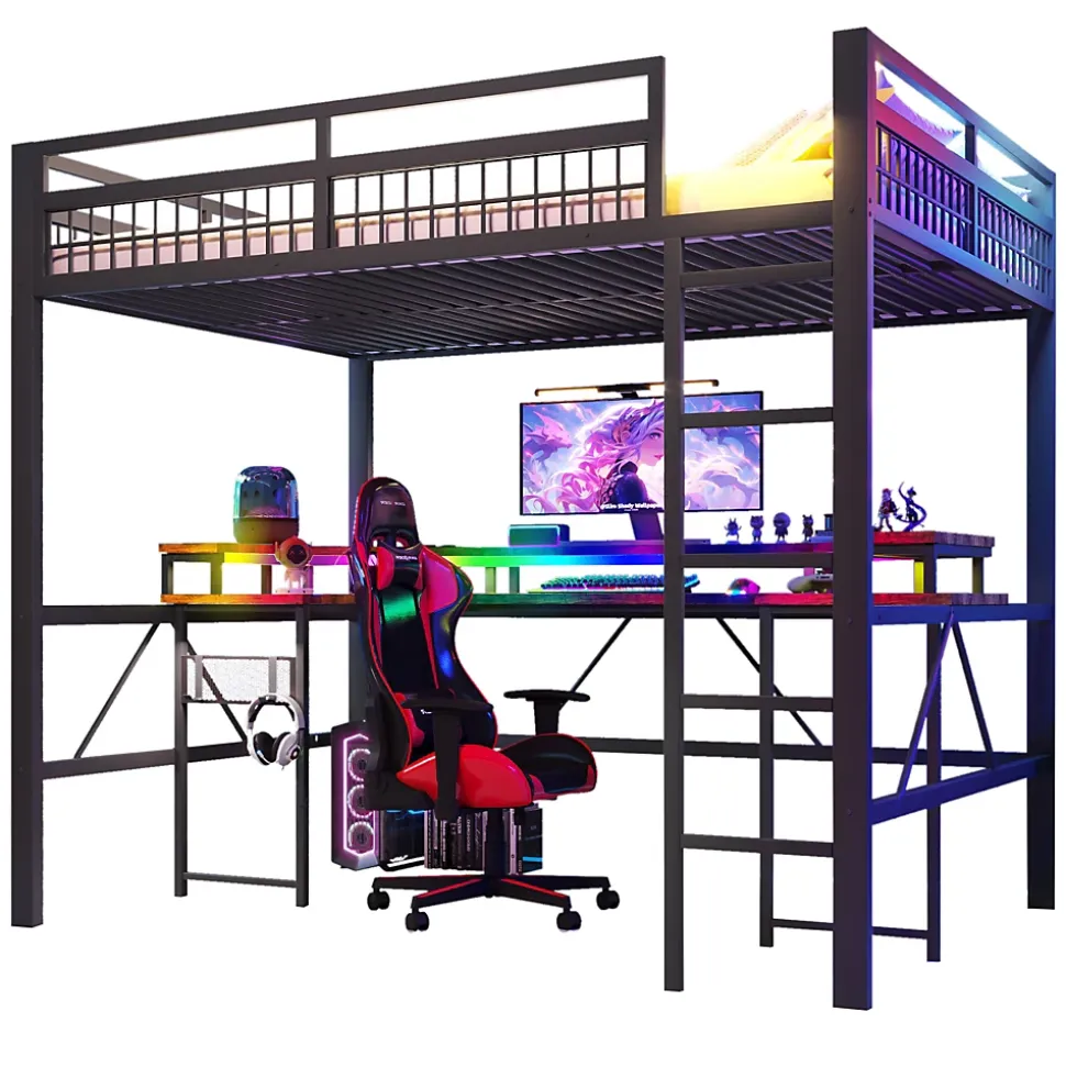 ▶ ▶ Détails ▶────────────────✦ Type de produit : Lit mezzanine✦ Couleur : Noir✦ Matériau : Métal + MDF✦ Dimensions du lit : 140 × 200 cm✦ Dimensions du produit : 204 × 144,5 × 180,5 cm✦ Poids net : 60 kg✦ Capacité maximale (lit) : 150 kg✦ Matelas inclus : Non✦ Épaisseur recommandée du matelas : 10 cm✦ Éclairage : Bande LED à changement de couleur✦ Ports de charge : 1 port USB + 1 port Type-C + 2 prises✦ Équipement : Bureau intégré, panneau perforé✦ Nombre de colis : 3✦ Montage requis : Oui► Remarques ►※ Ce produit est livré en 3 colis. Ils peuvent arriver à des moments différents.※ En raison de mesures manuelles, un écart de 2–3 cm peut se produire.※ Les images du produit sont prises avec le produit réel, mais des variations de couleur peuvent se produire en fonction de l’éclairage.