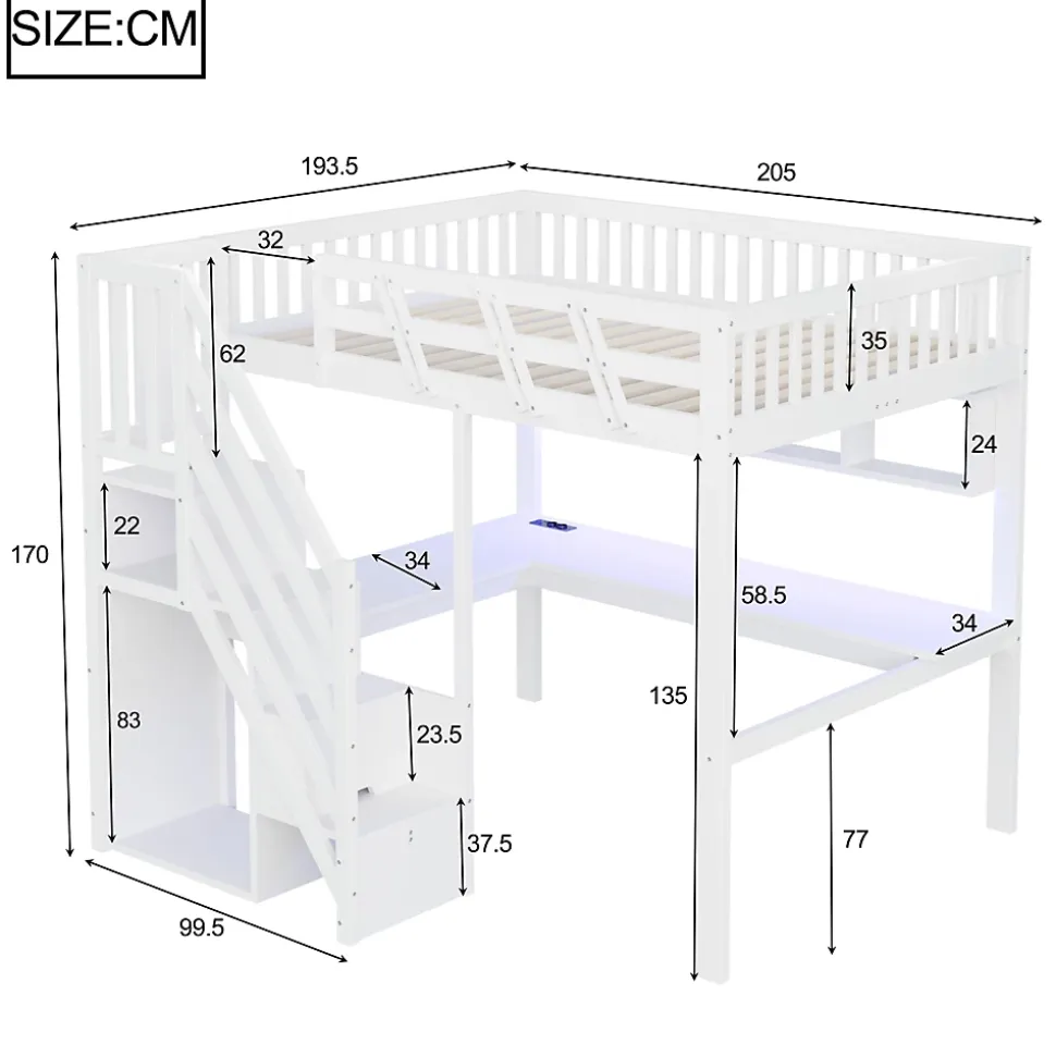 ▶ ▶ Détails ▶────────────────● Type de produit : Lit mezzanine● Couleur : Blanc● Materiau : Bois massif + contreplaque + MDF● Dimensions totales : 205 × 193,5 × 170 cm● Dimensions du couchage : 140 × 200 cm (Sans matelas)● Capacite de charge maximale : 150 kg● Poids net : 85 kg● Accessoires inclus : Bureau integre, LED, prise USB, rangement avec escalier● Assemblage : Complet / partiel requis, outils inclus, sans outils electriques● Temps estime d’assemblage : 1 heure● Personnes recommandees pour l’assemblage : 2● Nombre de colis : 4● Poids des colis : 24,6 kg / 26,1 kg / 18,3 kg / 25,1 kg► Remarques ►※ Les mesures sont approximatives et peuvent varier legerement.※ Les couleurs peuvent legerement differer de l’image en raison de l’eclairage ou de l’ecran.※ Le matelas n’est pas inclus.※ Pour toute question lors de l’installation, veuillez nous contacter des que possible.