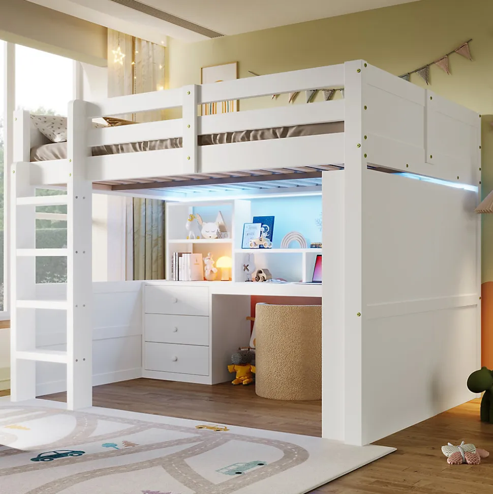 ▶ ▶ Détails ▶────────────────● Type de produit : Lit mezzanine● Couleur : Blanc● Matériaux : Pin massif + MDF + contreplaqué● Dimensions totales : 204,5 × 148 × 148 cm● Dimensions du couchage : 140 × 200 cm● Poids du produit : 118 kg● Capacité de charge : 160 kg● Éclairage LED : Oui● Matelas inclus : Non● Épaisseur de matelas recommandée (lit supérieur) : 10 cm● Montage requis : Oui● Nombre de colis : 5● Origine : Chine► Remarques ►※ En raison des mesures manuelles, une tolérance de 2 à 3 cm peut être constatée.※ De légères variations de couleur peuvent apparaître selon l’éclairage ou l’affichage de l’écran.※ Le produit est livré en 5 colis pouvant arriver séparément.※ En cas de question lors du montage, veuillez nous contacter rapidement.※ Veuillez noter que la longueur des lattes ne correspond pas exactement aux dimensions intérieures du lit.