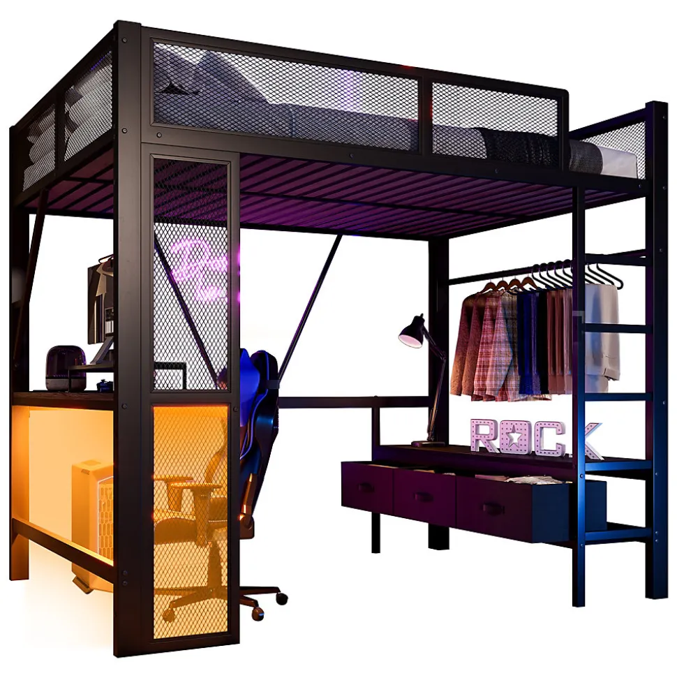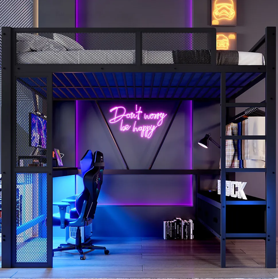 - 【Éclairage LED modulable】 Le bandeau LED placé sous le bureau ou le lit peut être réglé via télécommande avec différentes intensités et couleurs, créant un éclairage fonctionnel pour le travail ou une ambiance douce pour le sommeil.