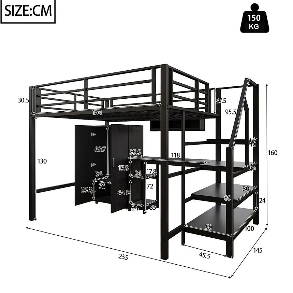 Lit mezzanine multifonction 140×200 cm – Noir (Métal + MDF)Espace optimisé pour chambre d’enfant :Structure complète : Lit haut + bureau intégré + armoire + étagèresRangement intelligent : Étagères multiples + espace sous l’échelle aménagéBureau pratique : Surface de travail intégrée pour études et jeuxStructure robuste : Cadre métal + panneaux MDF (support 150kg)Caractéristiques techniques :Dimensions totales : 255x145x160 cmEspace lit : 140×200 cm (matelas 10cm non inclus)Livraison : 4 colis (27.2kg + 28.56kg + 24.45kg + 29.27kg)Montage : Requis (notice incluse)Idéal pour : Optimisation d’espace, chambre d’enfant fonctionnelle