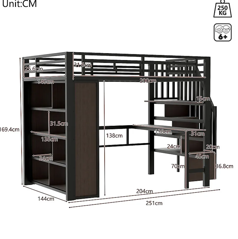 •【Matériaux de qualité supérieure】L’ingénieuse combinaison d’une structure en fer robuste et durable et de panneaux de fibres de moyenne densité (MDF) offre une surface lisse. Ces deux matériaux se complètent parfaitement, créant un lit mezzanine à la fois élégant et pratique.•【Nombreux espaces de rangement】Les étagères à plusieurs niveaux sont agencées avec soin pour répondre à tous vos besoins de rangement. Livres, objets de décoration ou objets du quotidien, chaque chose trouvera facilement sa place, pour une chambre propre et bien rangée.•【Rangement astucieux】La conception unique en escalier s’intègre astucieusement à l’espace de rangement, facilitant l’accès aux objets. Elle dissimule également un espace de rangement supplémentaire, doublant ainsi la fonctionnalité et optimisant l’utilisation de l’espace.•【Éclairage LED intelligent】L’éclairage LED intégré, contrôlable via une application, vous permet de personnaliser la luminosité et la couleur, créant une ambiance chaleureuse et romantique et sublimant votre intérieur.•【Plateau pratique】Le plateau spacieux et plat offre une surface confortable pour travailler, étudier ou se détendre, faisant de ce lit un allié précieux au quotidien.•【Facile à assembler】Des instructions détaillées et des pièces complètes sont disponibles pour vous aider à réaliser l’assemblage rapidement.