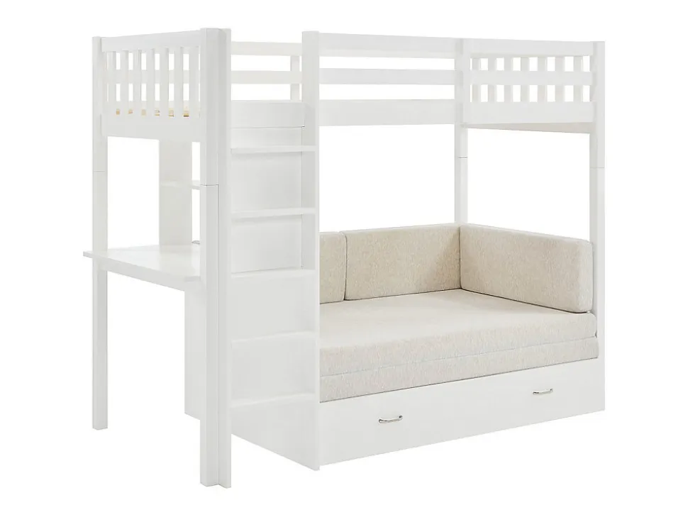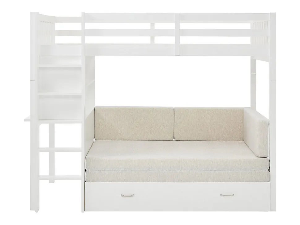 - Lit mezzanine 90 X 190 cm avec sofa convertible – Structure : Pin et MDF – Coloris : Blanc – Dim : L198 x P102,5 x H160 cm – Style : Contemporain – ORPELIA : le lit mezzanine qui allie style et praticité !