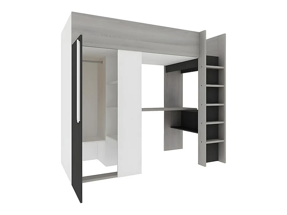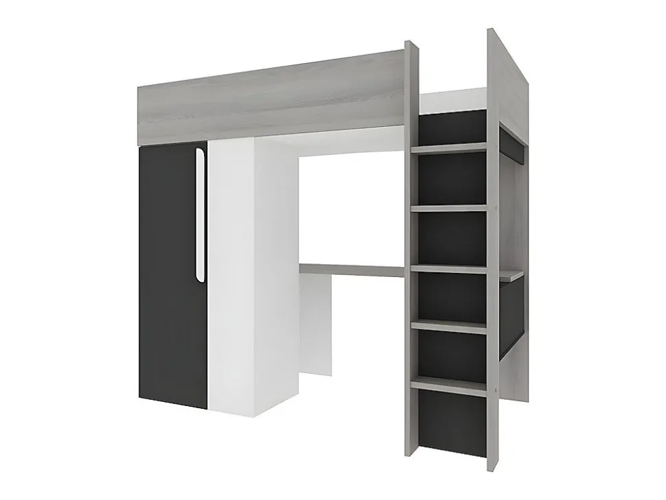 - Lit mezzanine NICOLAS II avec armoire et bureau – 1 niche – 90 x 200 cm. Structure : Panneaux de particules. Coloris : Gris Blanc et Noir. Dim : L205,2 x P110 x H183,1 cm. Meublez votre chambre en une seule fois avec le lit 3 en 1 NICOLAS II !