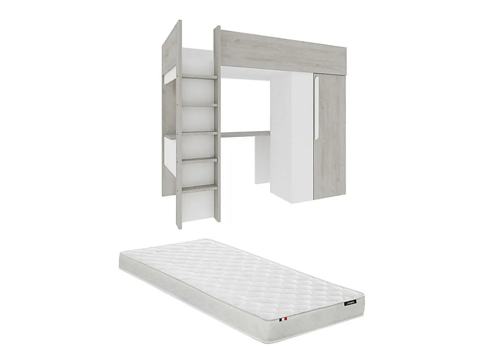 Aussi moderne qu’astucieux, le lit NICOLAS saura vous surprendre en vous offrant un gain de place incroyable. En plus de son bureau d’angle intégré, ce lit mezzanine possède une grande armoire composée d’une lingère et de 4 étagères. Très pratique, ce lit sera idéal pour amménager la chambre d’un adolescent !1 x Lit mezzanine NICOLASCaractéristiques Couleur (nuance) : Blanc, Gris clair Matière (précision) : Panneau de particule Finition : Mélaminé Taille (couchage) : 90 x 200 cm Nombre de places : 1 place Avec sommier Type de sommier : Cadre à lattes, Sommier plein en panneau Avec bureau 1 porte Porte battante Type de rangement : 4 niches, 1 penderie Tiroir coulissant Gamme : Good for Planet Produit : Fabriqué en Europe Charge maximale supportée : 75 kg À monter soi-même : Bureau intégré : Armoire 1 porte : Compatible avec tous les matelas 90×200 cm : Attention, le lit ne convient pas aux enfants de moins de 6 ansDimensions Longueur : 205.2 cm Hauteur : 183.1 cm Profondeur : 110 cm Hauteur de couchage : 148 cm Hauteur sous la mezzanine : 148 cm Hauteur de la barrière de sécurité : 35 cm Bureau : L152 x P45 x H75 cm Armoire : L79 x P91 x H148 cm Niche : L110 x P38 x H33 cm1 x Matelas classique ZEUSCaractéristiques Technologie (âme) : Mousse Soutien : Ferme Densité (âme) : 25 kg/m³ Technologie matelas (accueil) : Mousse de confort Densité (accueil) : 20 kg/m³ Accueil : Tonique Garnissage du matelas : Ouate hypoallergénique Densité (garnissage) : 400 g/m2 Coutil (matière) : Polyester Couleur (nuance) : Blanc Matière (précision) : 45 % Polyester Composition % tissu Polypropylène : 55 % Taille (couchage) : 90 x 200 cm Nombre de places : 1 place Traitement : Anti-acariens, Anti-bactériens Gamme : Good for Planet Produit : Mousse CertiPUR, Fibre OEKO-TEX, Fabriqué en France Compressé/roulé : Compressé/rouléDimensions Longueur : 200 cm Hauteur : 15 cm Profondeur : 90 cm Epaisseur matelas : 15 cm Hauteur de l’âme : 12 cmLivraisonLors de