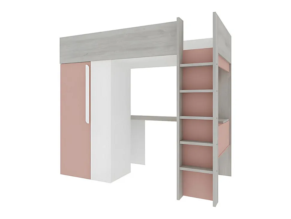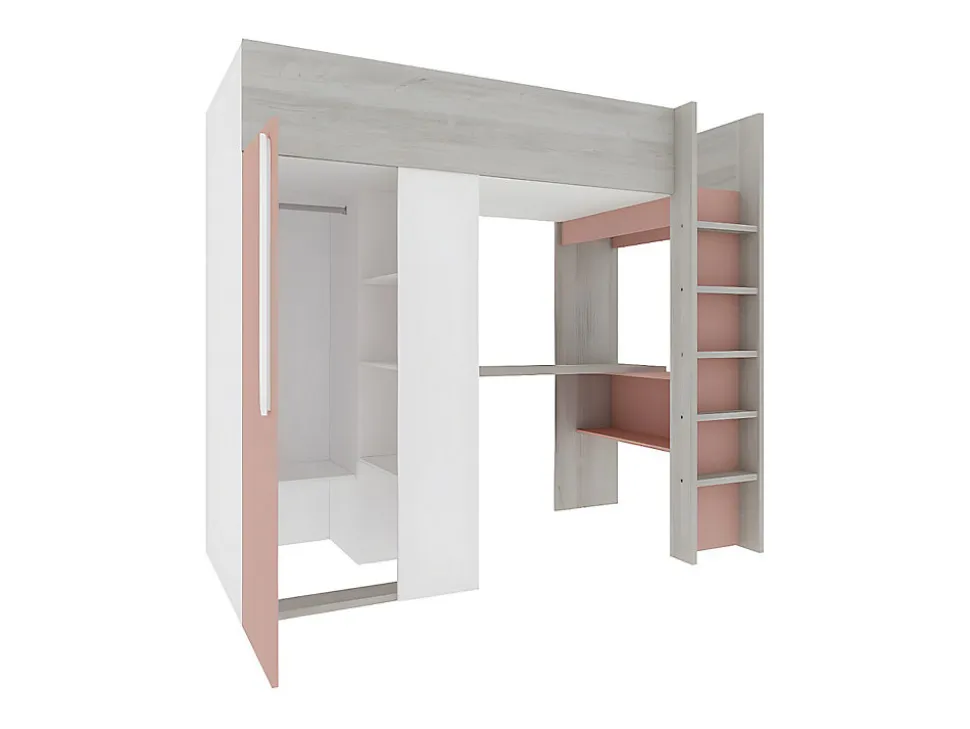 - Lit mezzanine NICOLAS – avec armoire et bureau – 1 niche – 90 x 200 cm. Structure : Panneaux de particules. Coloris : Gris Blanc et rose. Dimensions : L201,6 x P110 x H183,1 cm. Meublez votre chambre en une seule fois avec le lit 3 en 1 NICOLAS !