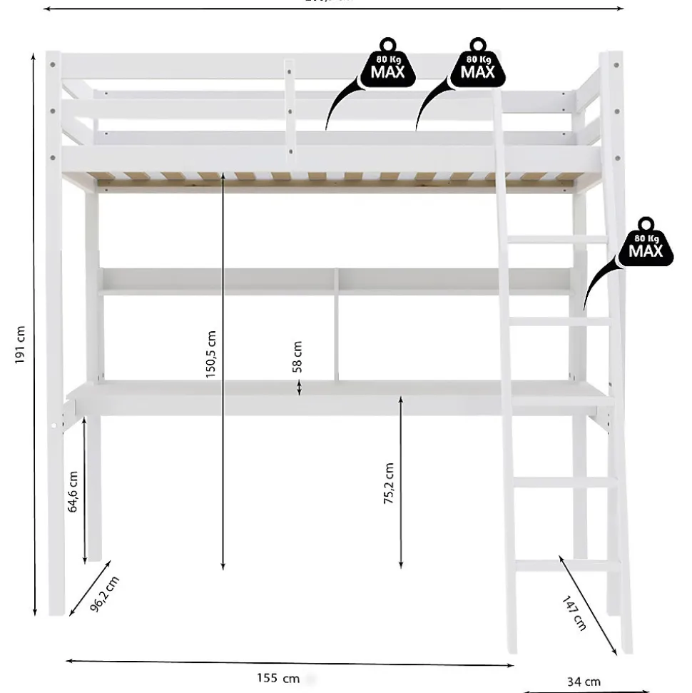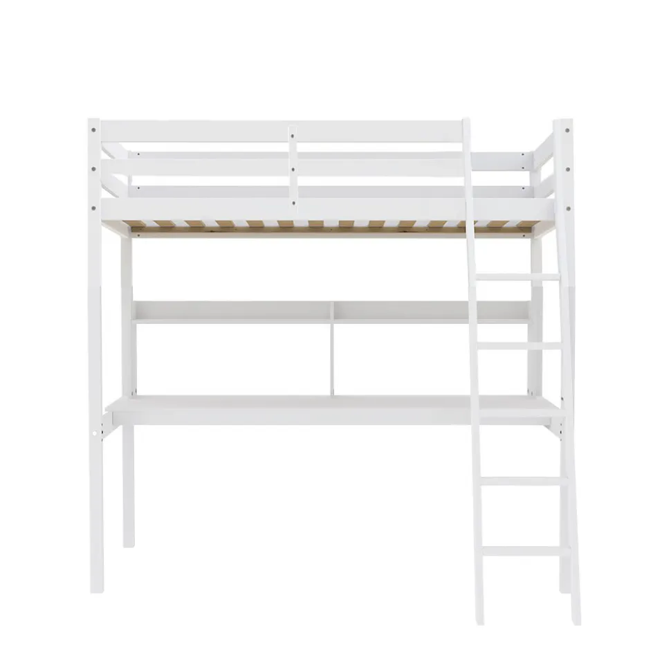 Lit Mezzanine 90x190cm blanc SALA avec Bureau et étagères incl. Sommier et échelle