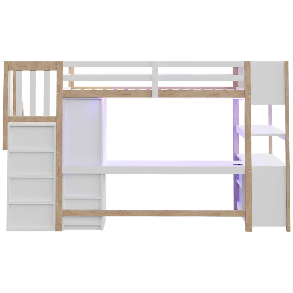 •【Bureau spacieux avec prise électrique standard européenne】Ce lit mezzanine est doté d’un bureau spacieux sous le couchage, équipé d’une prise électrique multifonctionnelle pour brancher divers appareils électroniques. Son design pratique est idéal pour travailler, étudier ou se détendre.•【Armoire intégrée】Ce lit mezzanine comprend une armoire intégrée pour un rangement pratique des vêtements, optimisant ainsi l’espace. Se changer devient facile et rapide.•【Éclairage LED multicolore】La structure du lit intègre des lumières LED. Les utilisateurs peuvent contrôler la bande lumineuse via leur smartphone et choisir parmi une variété de couleurs néon pour créer l’ambiance souhaitée.•【Escalier avec rangements intégré】Ce lit mezzanine dispose de quatre compartiments de rangement sous l’escalier, pratiques pour ranger livres, jouets, vêtements et autres objets, optimisant ainsi l’espace de la chambre et simplifiant l’organisation.•【Rangement intégré à la tête de lit】Ce lit simple en bois est doté d’un espace de rangement intégré dans la tête de lit, pratique pour ranger des objets tels que téléphones, réveils et livres pendant le sommeil.•【Étagères à plusieurs niveaux】Ce lit en bois est doté d’étagères à plusieurs niveaux, idéales pour sublimer la décoration intérieure. Vous pouvez y exposer des décorations, des plantes, des jouets et autres objets. Sa taille généreuse permet également d’y accueillir des objets plus volumineux, ce qui renforce son attrait décoratif.•【Facile à assembler】Des instructions détaillées et des pièces complètes sont disponibles pour vous aider à réaliser l’assemblage rapidement