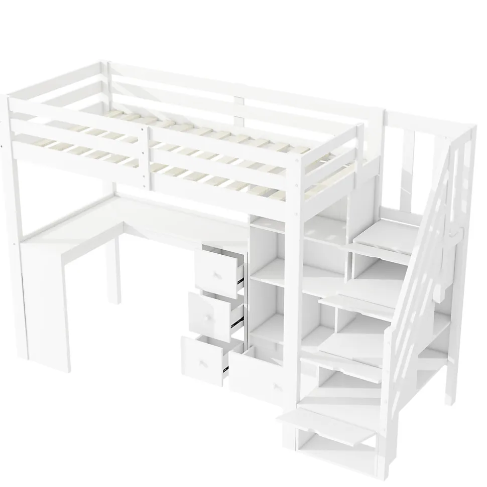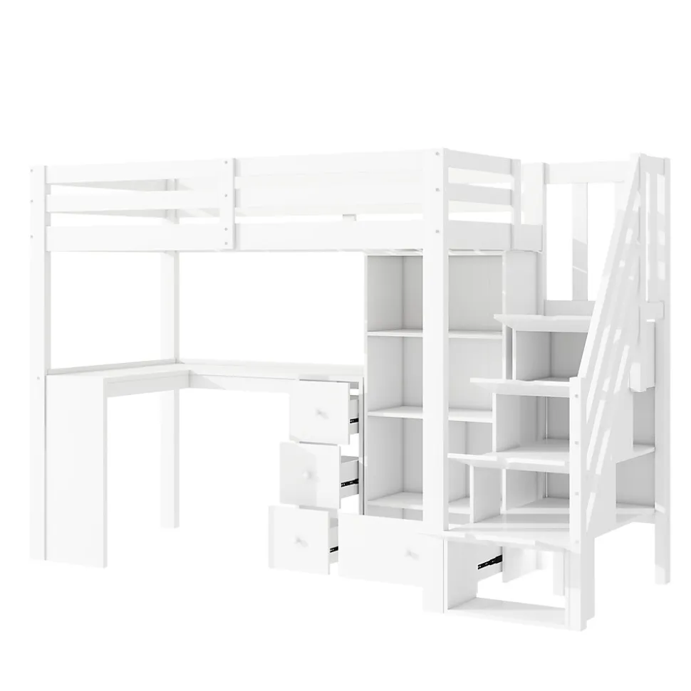 - Agencement optimisé avec bureau spacieux, tiroirs intégrés, placard ouvert et étagères multiples pour un rangement ordonné. Échelle de rangement pratique facilitant l’accès au couchage 90×200 cm.