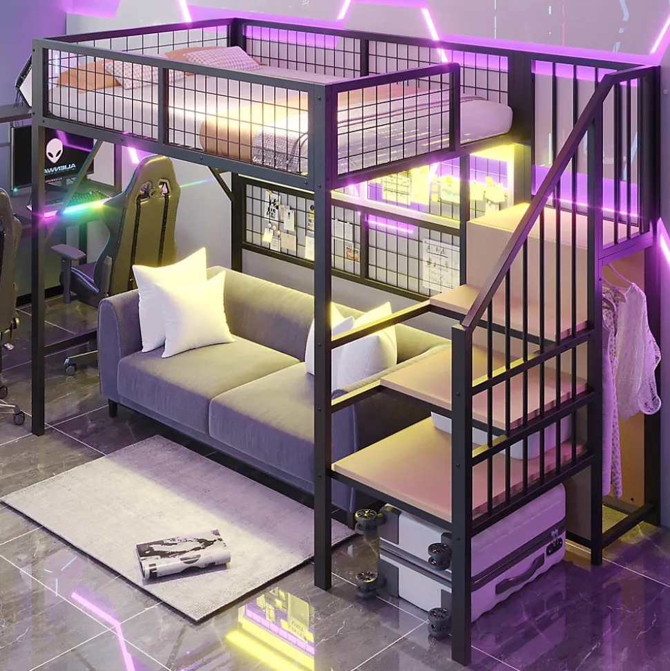 - Fonctionnalités pratiques : échelle latérale avec étagères ouvertes et petit dressing intégré, filet périphérique de sécurité et bande LED pilotable via application pour régler couleur et intensité.