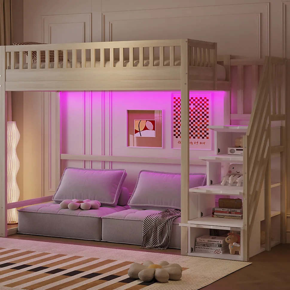 •【Sécurité renforcée 】Les barrières de lit plus hautes et les garde-corps continus entourant la zone de couchage offrent une protection fiable contre les chutes, garantissant un environnement de sommeil plus sûr pour les enfants et les adolescents. Une échelle robuste assure une stabilité optimale et un accès facile au lit.•【Échelle de rangement intégrée】Chaque barreau de l’échelle dissimule un espace de rangement pour les livres, les vêtements, le linge de lit ou les objets du quotidien, contribuant ainsi à garder la chambre propre et bien rangée.•【Espace ouvert sous le lit】L’espace ouvert sous le lit offre une grande flexibilité, permettant une configuration personnalisée de la chambre. Vous pouvez l’utiliser comme coin devoirs, coin lecture, espace de jeux ou aire de jeux pour enfants. À mesure que votre enfant ou adolescent grandit, cet espace peut être facilement réaménagé pour répondre à ses besoins.•【Éclairage LED intégré】Ce lit mezzanine est équipé de bandes lumineuses LED en partie basse, diffusant une lumière d’ambiance douce, améliorant la visibilité nocturne et créant une atmosphère chaleureuse et confortable.•【Construction en bois robuste】Ce lit mezzanine est fabriqué en bois durable et renforcé par un cadre solide, offrant une stabilité supérieure et une capacité de charge fiable.•【Escalier rétractable】L’escalier peut être installé à gauche ou à droite du lit, offrant une grande flexibilité d’installation pour s’adapter à différentes configurations de pièce et optimiser l’espace.•【 Montage facile】Des instructions détaillées et toutes les pièces nécessaires sont fournies pour un montage rapide.