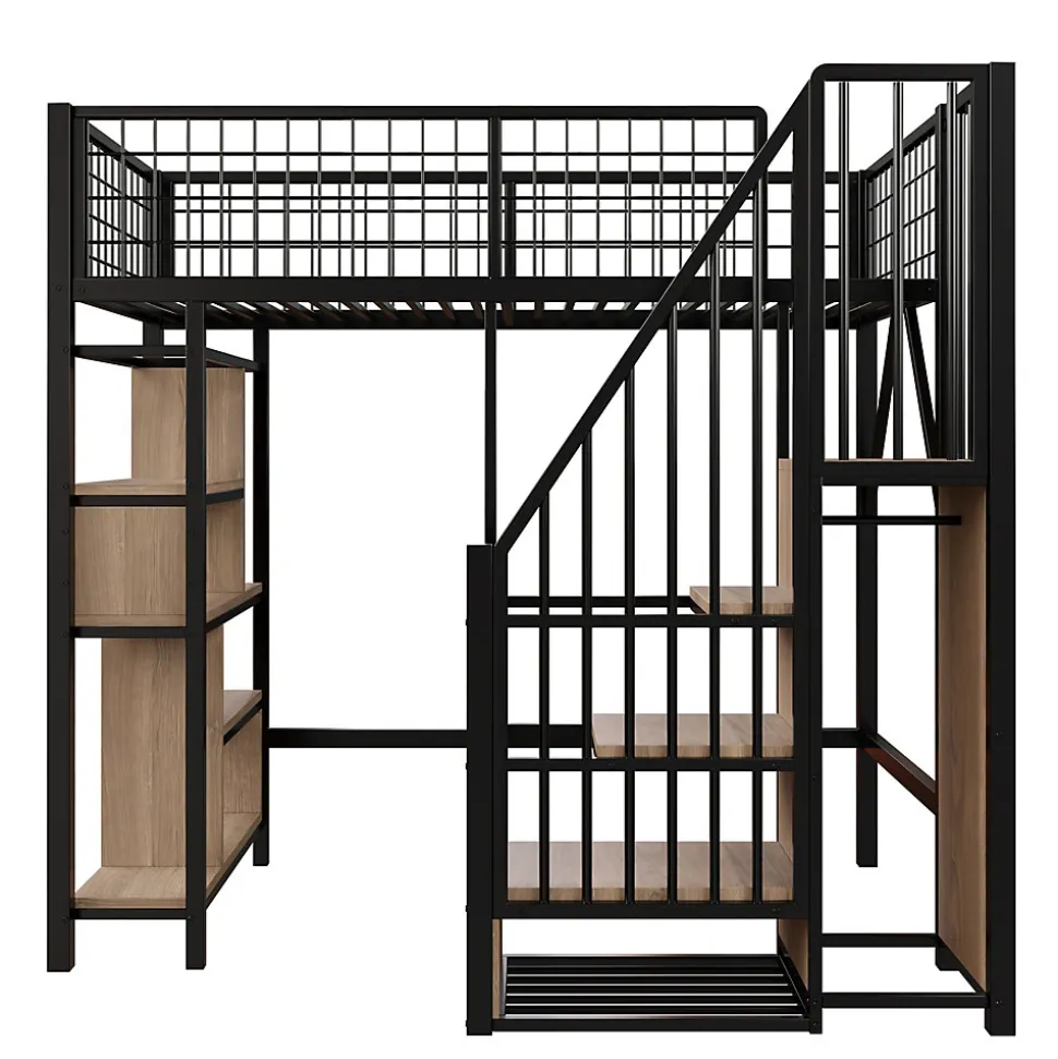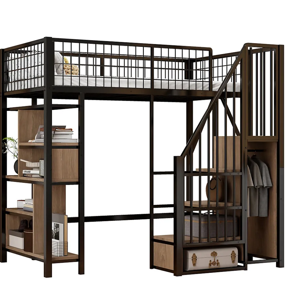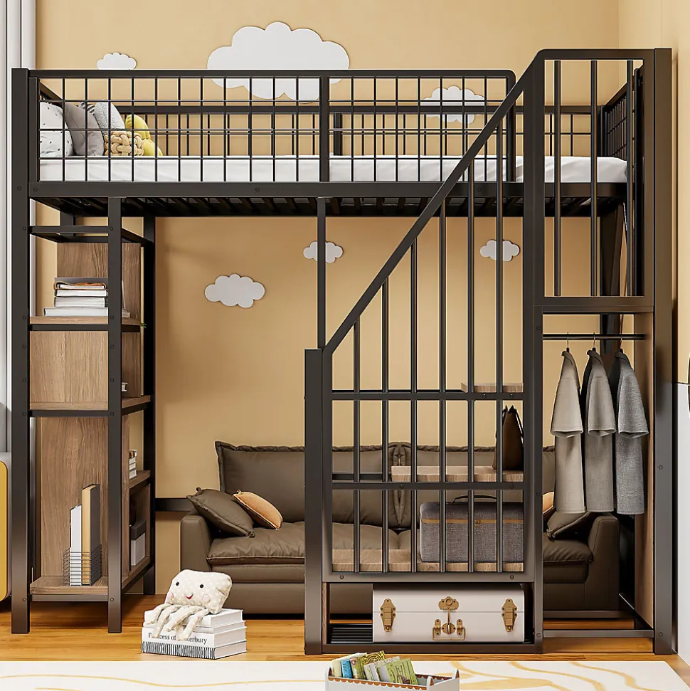 - Escalier coffre stable offrant des marches de rangement pour chaussures et livres, grand espace libre sous le lit modulable en bureau, coin détente ou zone de stockage ; couchage 90×200 cm compatible.