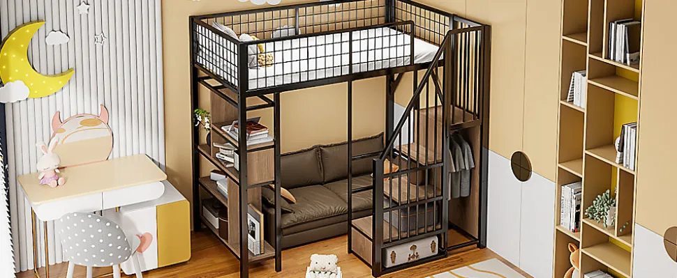 Design & styleCe lit mezzanine noir présente un style minimaliste et fonctionnel, conçu pour maximiser l’espace dans les logements compacts. L’association d’une structure métal et de panneaux en bois offre une silhouette contemporaine et sobre, adaptée à différents intérieurs sans surcharger la pièce.Fonctionnalités & rangement Escalier coffre stable avec marches servant de rangements pratiques pour chaussures, livres ou petits objets. Grand espace libre sous le lit pouvant être aménagé en bureau, coin lecture, coin TV ou zone de rangement selon les besoins. Plusieurs compartiments intégrés pour une organisation optimisée et un gain de place évident.Matériaux & entretienStructure en métal associée à des panneaux en contreplaqué et MDF pour une bonne stabilité et durabilité. Surfaces faciles à nettoyer avec un chiffon doux et un produit non abrasif. Conception adaptée à un usage quotidien tout en conservant une apparence soignée.Dimensions & caractéristiquesCouchage 90×200 cm. Dimensions totales : 204x143x170 cm. Poids total du produit : 76 kg. Poids colisé : 82 kg. Nombre de lattes : 20. Épaisseur de matelas recommandée : 8–10 cm. Capacité de charge indiquée : 114 kg.Montage & livraisonMontage complet requis, temps estimé 2 heures avec deux personnes recommandées. Produit livré en 3 colis pouvant arriver séparément. Outillage de base fourni ; évitez l’utilisation d’outils électriques pour préserver les éléments de fixation.