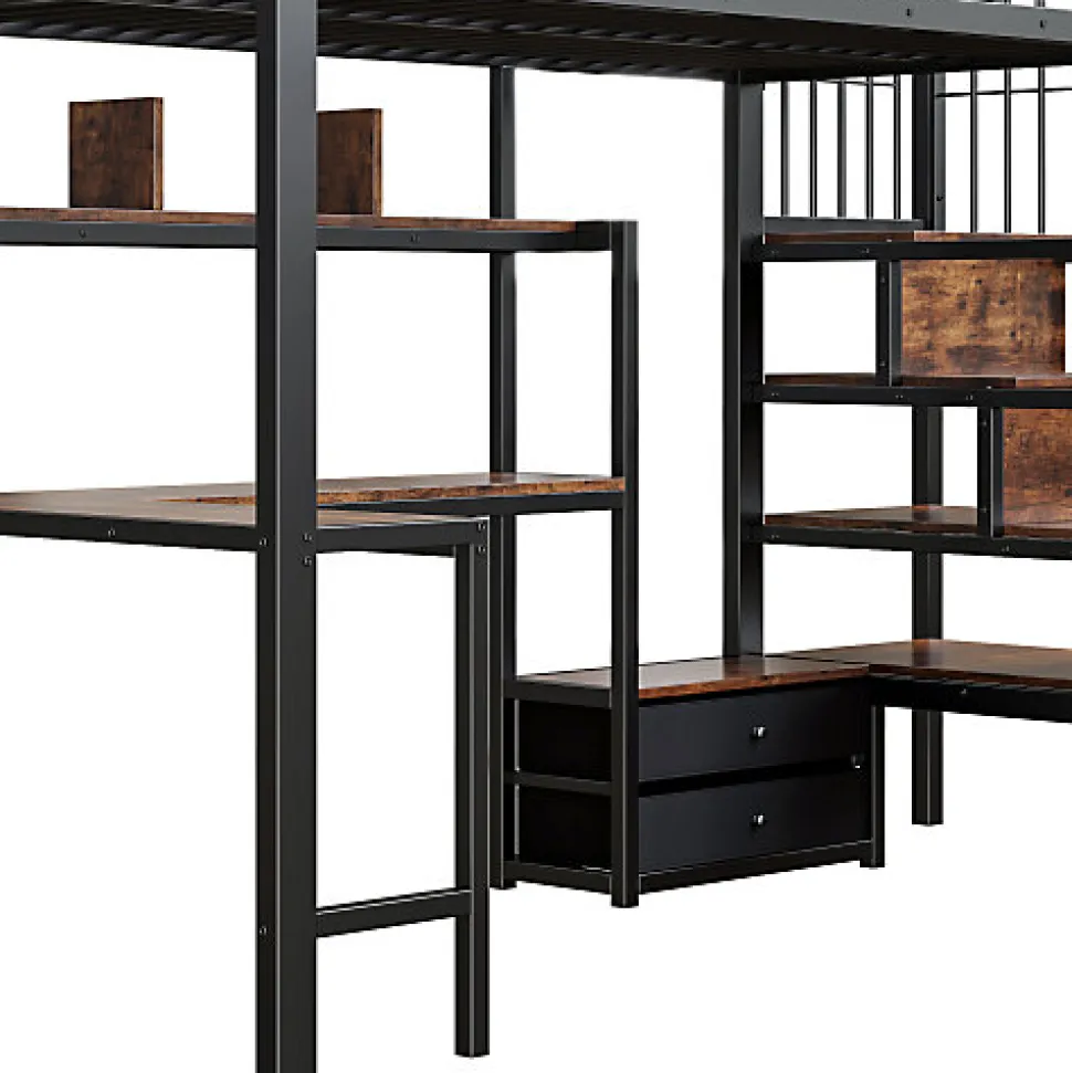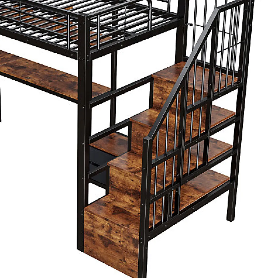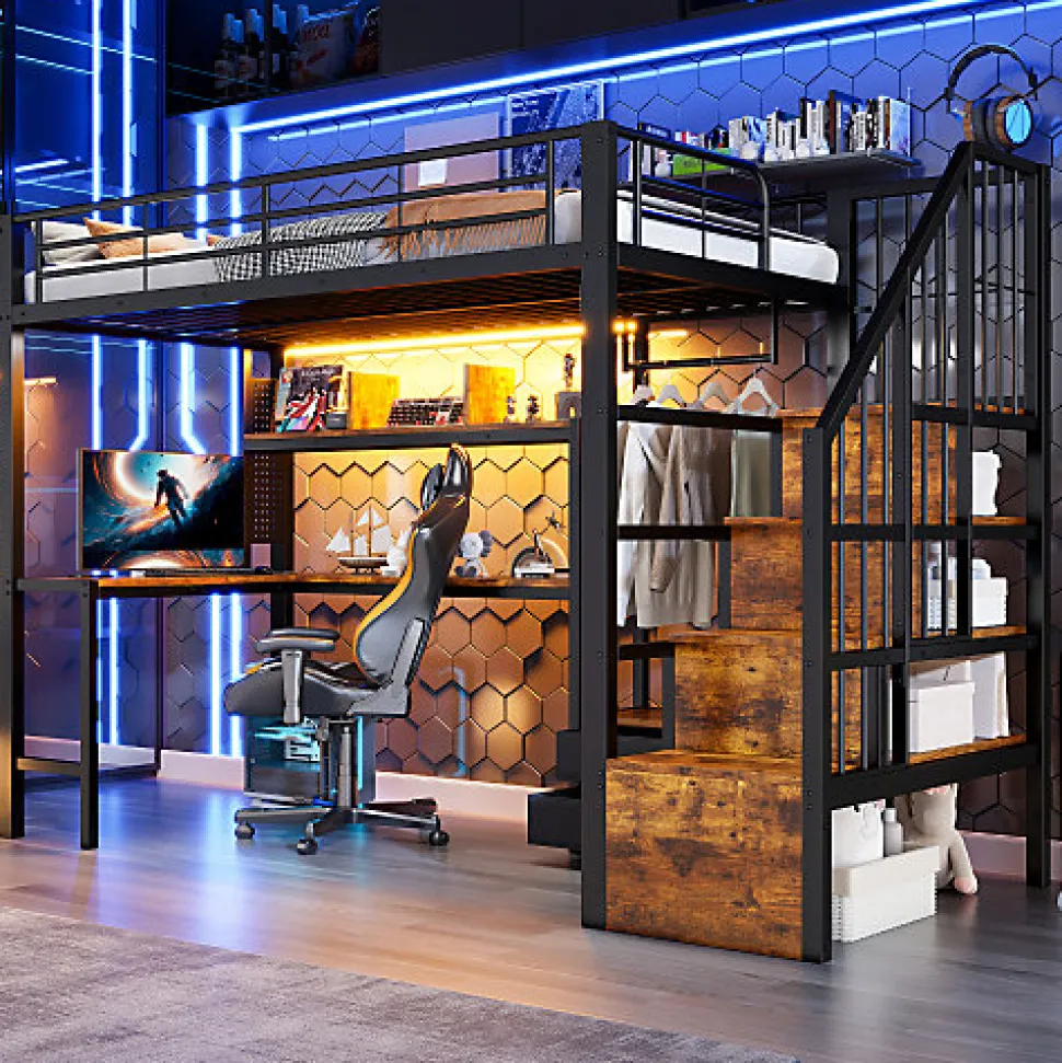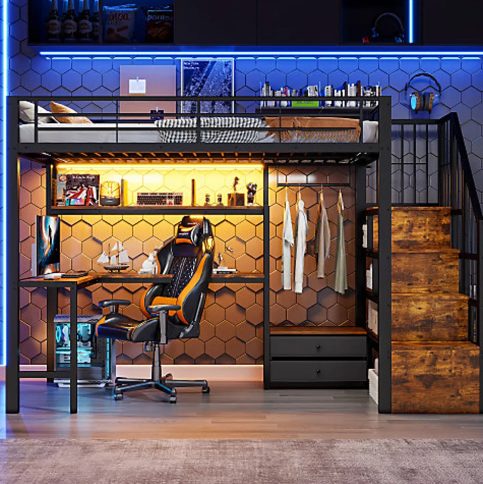 •【Espace de jeu et de repos multifonctionnel】Ce lit mezzanine intègre harmonieusement une chambre surélevée avec un bureau, une bibliothèque et un portant, idéal pour les adolescents et les petits appartements. Il optimise l’espace en combinant couchage, jeu, étude et rangement.•【Éclairage LED intégré pour une ambiance chaleureuse】Des bandes lumineuses LED sont installées sous le lit et dans l’espace bureau. Adaptables d’une simple pression sur un bouton ou via une application, elles permettent de régler facilement la luminosité et la couleur. L’éclairage crée une ambiance chaleureuse ou dynamique, soulignant le style moderne du lit.•【Rangement astucieux】Des coffres de rangement rectangulaires intégrés à l’escalier offrent un grand espace de rangement pour les vêtements, les jouets ou le linge de lit. De plus, des étagères en bois ouvertes, des tiroirs et des portants répondent à tous vos besoins pour une chambre bien rangée.•【Sécurité et stabilité garanties】Une structure métallique de haute qualité assure une grande robustesse et une excellente durabilité. Les barrières de sécurité hautes autour du lit supérieur préviennent les chutes et conviennent aux enfants à partir de 6 ans.•【Style industriel moderne】Une structure métallique associée à un design rustique en bois crée un style classique et intemporel qui s’intègre harmonieusement dans une variété d’espaces intérieurs — des salles de jeux et chambres d’adolescents aux appartements modernes — ajoutant une touche de modernité à n’importe quelle pièce.•【Facile à assembler】Des instructions détaillées et des pièces complètes sont disponibles pour vous aider à réaliser l’assemblage rapidement.