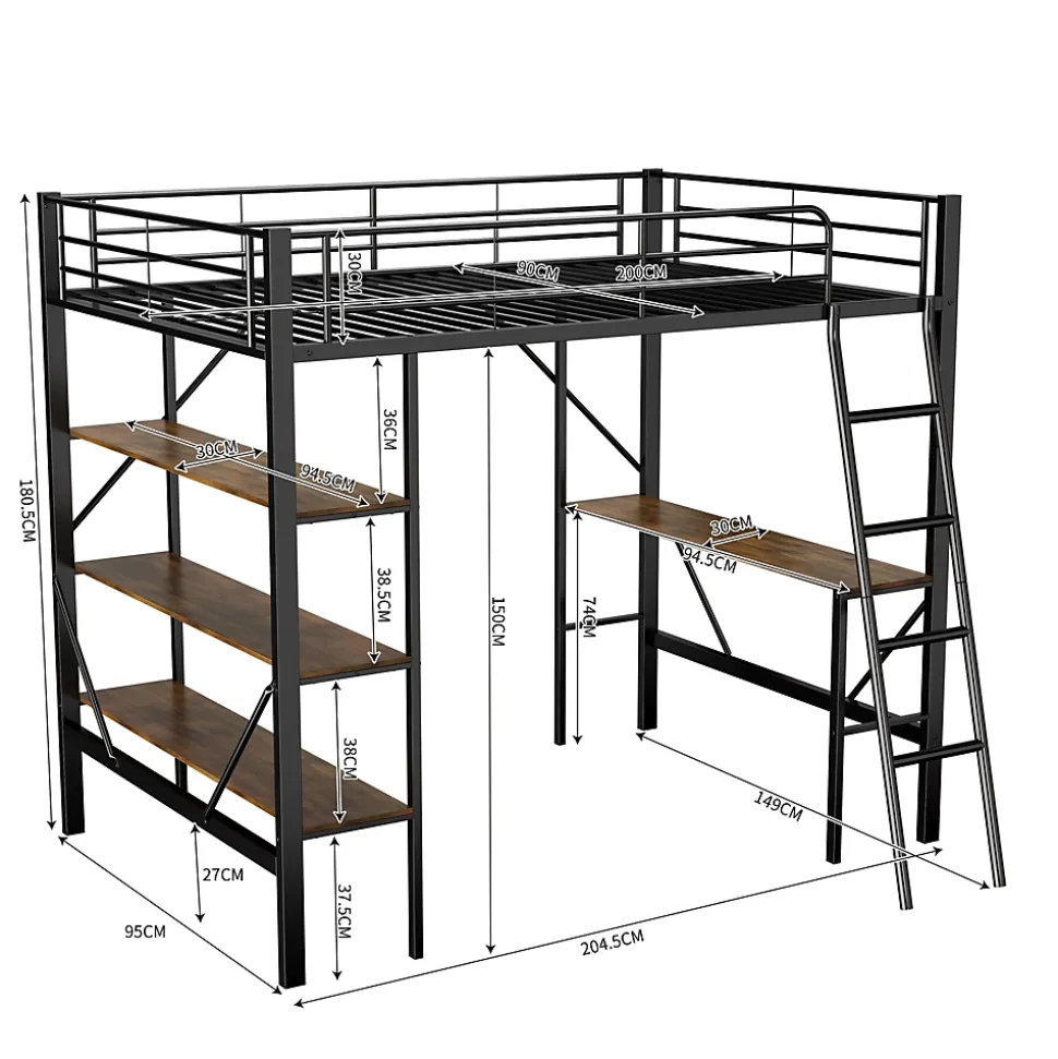 ▶ ▶ Détails ▶────────────────● Nom du produit : Lit mezzanine avec bureau et 3 grandes étagères et échelle● Dimensions du produit : 204.5 x 149 x 180.5 cm● Matériau du lit : Métal + MDF● Taille : 90 x 200 cm● Couleur : Noir● Dimensions de l’emballage : Veuillez vous référer aux spécifications● Dimensions internes du lit : 90 x 200 cm● Hauteur totale : 180.5 cm● Capacité de poids : 120 kg● Nombre de lattes : 24 pièces● Épaisseur de matelas recommandée : 10-15 cm (sans matelas)● Montage requis : Oui● Nombre de colis : 2► Remarques ►※ Ce produit est livré en 2 colis. Ils peuvent arriver séparément. Merci de patienter.※ En raison des mesures manuelles, une marge d’erreur de 2-3 cm est possible.※ En raison des conditions d’éclairage, il peut y avoir une différence de couleur entre l’image du produit et le produit réel. Veuillez vous référer au produit effectivement reçu.※ Si vous avez des questions lors de l’installation, veuillez nous contacter dès que possible.