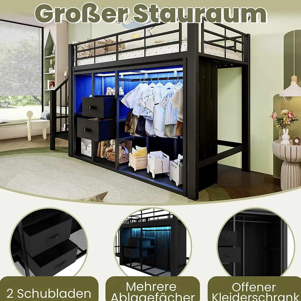 ▶ ▶ Détails ▶────────────────● Nom du produit : Lit mezzanine● Matériau : Métal + MDF● Couleur : Noir● Dimensions du produit : 255 × 95,5 × 139 cm● Dimensions du lit : 90 × 200 cm● Poids maximal supporté : 120 kg● Recommandation pour l’épaisseur du matelas : 10 cm (matelas non inclus)● Quantité de colis : 3● Montage requis : Oui● Origine : Chine► Remarques ►※ En raison de la mesure manuelle, un écart de 2-3 cm peut se produire.※ Toutes les images des produits sont prises avec des produits réels, mais des différences de couleur peuvent se produire en raison des effets de la lumière solaire et d’autres facteurs.※ Ce produit est expédié en 3 colis, qui peuvent ne pas arriver en même temps. Veuillez patienter.※ Si vous avez des questions lors de l’installation, n’hésitez pas à nous contacter.