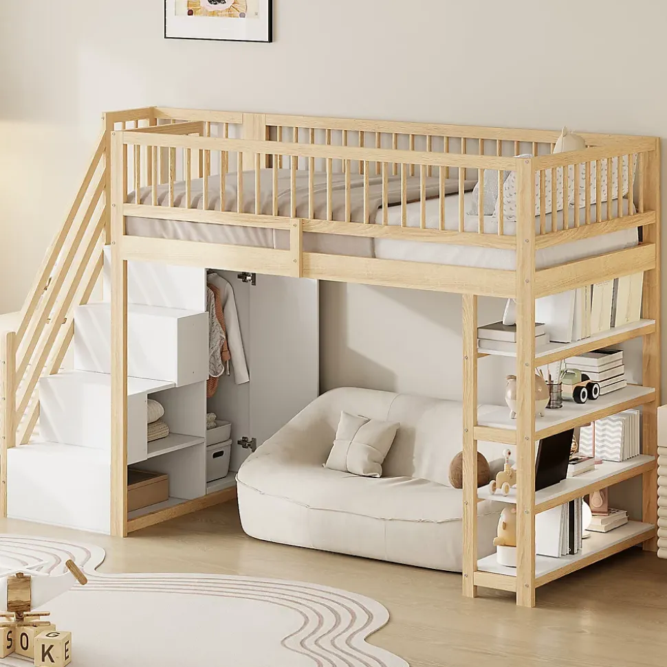 - 【Rangement généreux】 Les placards, armoires et étagères intégrés sous le lit offrent un espace de rangement considérable pour les vêtements, les jouets ou autres objets, ce qui vous permet de garder votre chambre bien organisée.