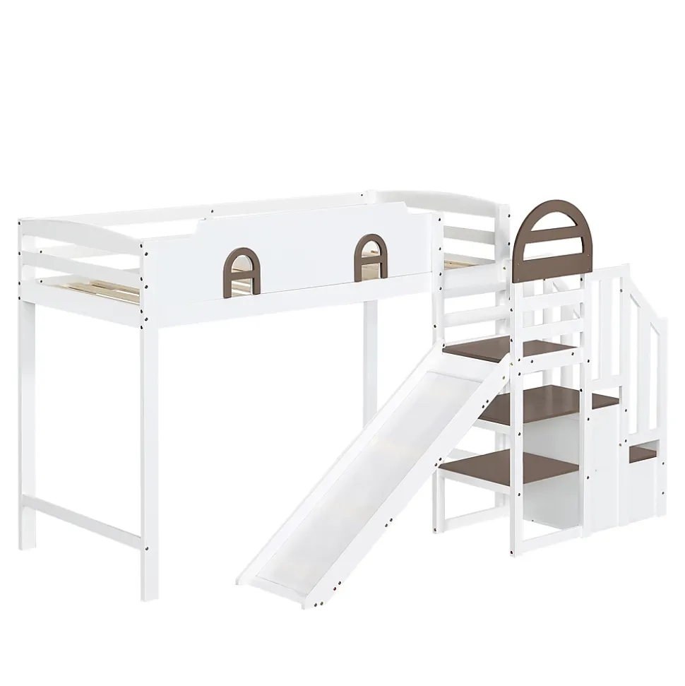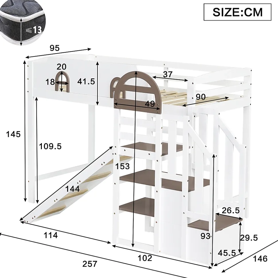 ▶ ▶ Détails ▶────────────────● Nom du produit : Lit pour enfant● Couleur : Blanc + Marron● Dimensions totales : 257x146x145 cm● Poids total : 45,5 kg● Hauteur du lit par rapport au sol : 109,5 cm● Matelas compatible (matelas non inclus) : 90×200 cm (épaisseur ≤ 13 cm)● Capacité de charge – Lit : 120 kg● Capacité de charge – Toboggan : 50 kg● Matériau du cadre : Pin + MDF + Contreplaqué● Matériau des lattes : Bois● Montage : Auto-assemblage● Structure réversible : Non● Nombre de colis : 3► Remarques ►※ Ce produit est expédié en 3 colis, qui peuvent arriver séparément. Merci de patienter.※ Les mesures peuvent varier de 2 à 3 cm en raison d’une mesure manuelle.※ Toutes les images sont prises à partir de produits réels, mais des différences de couleur peuvent apparaître en raison de la lumière ou d’autres facteurs.※ La longueur correspond à la valeur frontale et la largeur à la valeur latérale. La taille exacte se réfère aux images.
