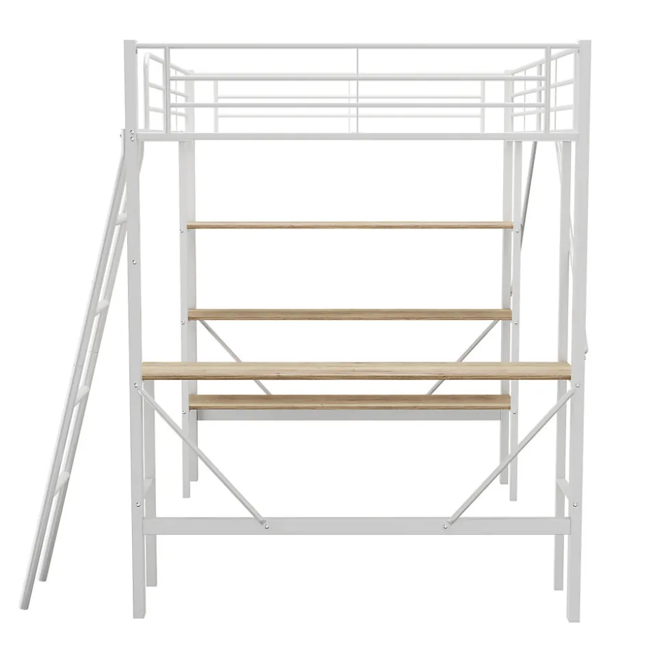 DescriptionLit Mezzanine 90×200 cm en Métal avec Bureau et Étagères – BlancMaximisez l’espace de votre chambre avec ce lit mezzanine moderne et fonctionnel. Idéal pour dormir, étudier ou travailler, il combine design minimaliste, sécurité et robustesse. Parfait pour les enfants, adolescents et étudiants.Points forts :1. Structure solide et durableCadre en acier robuste avec tubes épais pour une stabilité optimalePlateau en MDF solide et durable, conçu pour un usage quotidienCapacité de charge : 120 kg2. Fonctionnalité intégréeBureau spacieux pour travailler ou étudierTrois grandes étagères pour ranger livres, fournitures et objets personnelsLit supérieur entouré de barrières de sécurité pour prévenir les chutes3. Design moderne et minimalisteCouleur blanche neutre, adaptable à tous les styles d’intérieurParfait pour dortoirs, chambres d’enfants ou appartements compacts4. Sécurité certifiéeConforme à la norme EN747, adapté aux enfants à partir de 6 ansÉchelle fixe sécurisée pour un accès facile au lit supérieur5. Livraison et montageLivré en 2 colis depuis l’AllemagneAssemblage requis, instructions fourniesLes colis peuvent arriver à des dates différentes, merci de patienter ou contacter le service clientSpécifications :Dimensions totales du produit : 204.5 x 149 x 180.5 cm (L x l x H)Dimensions du lit : 90 x 200 cmMatériaux : Métal + MDFCouleur : BlancNombre de sommiers : 24 piècesÉpaisseur recommandée du matelas : 10-15 cmNombre de colis : 2Montage requis : Oui