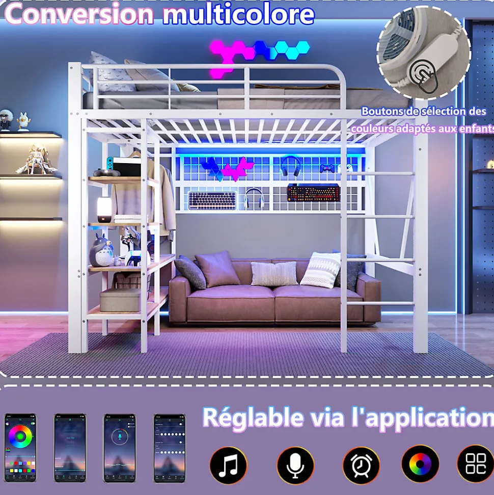 Lit mezzanine en fer 140 x 200 cm avec bande lumineuse LED, compartiment de rangement, tringle à vêtements, sans matelas, blanc