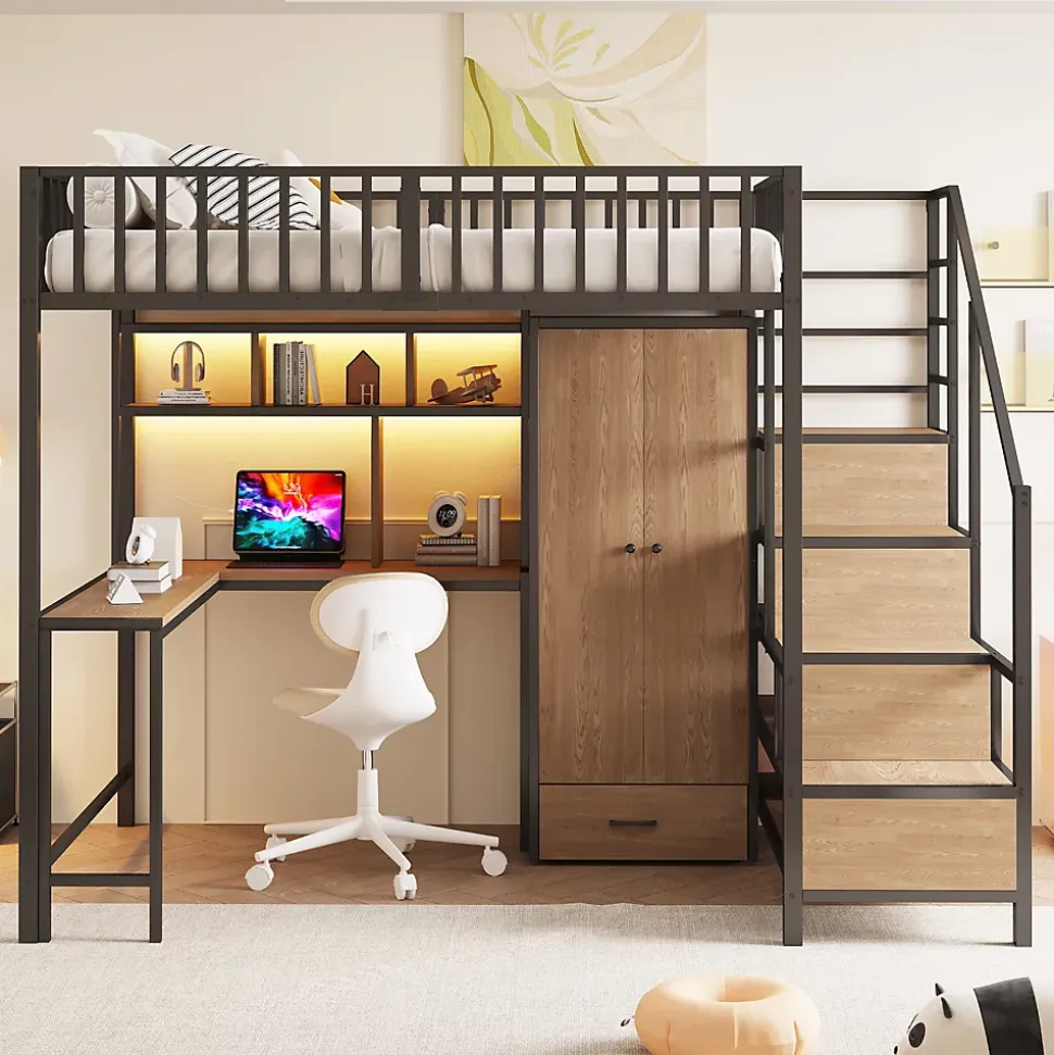 •【Lit mezzanine multifonctionnel avec barrières de sécurité】Ce lit mezzanine en métal dispose d’un espace de couchage à l’étage, entouré de barrières de sécurité verticales en métal pour une sécurité optimale. L’espace en dessous intègre astucieusement un bureau, une armoire et des rangements, optimisant ainsi l’espace de la chambre et améliorant sa fonctionnalité.•【Rangement intégré sous le lit】Ce lit mezzanine est équipé d’un bureau et d’étagères à plusieurs niveaux en dessous, créant un espace de travail ou d’étude idéal. De plus, l’armoire en dessous offre un grand espace de rangement grâce à ses tiroirs. L’armoire comprend également une tringle pour suspendre soigneusement les vêtements et autres objets.•【Éclairage d’ambiance LED et prises de recharge】Le rangement sous le lit de ce lit mezzanine en métal est doté d’un éclairage LED à couleurs changeantes pour créer une ambiance personnalisée. Le bureau sous le lit est équipé de prises électriques aux normes européennes, incluant des prises secteur, des ports USB et des ports USB-C pour recharger facilement vos appareils.•【Échelle de rangement sécurisée】Ce lit en métal est équipé d’une échelle de rangement sécurisée sur un côté pour un accès facile. L’espace de rangement supplémentaire sous l’échelle peut accueillir des livres, des jouets et autres objets.•【Structure métallique robuste】Ce lit mezzanine en fer forgé est doté d’une structure métallique haut de gamme, lui conférant une stabilité et une durabilité exceptionnelles. Alliant avec élégance le métal et les panneaux de bois, il est disponible en blanc ou en noir pour s’harmoniser avec tous les styles de décoration intérieure.•【Facile à assembler】Des instructions détaillées et des pièces complètes sont disponibles pour vous aider à réaliser l’assemblage rapidement.