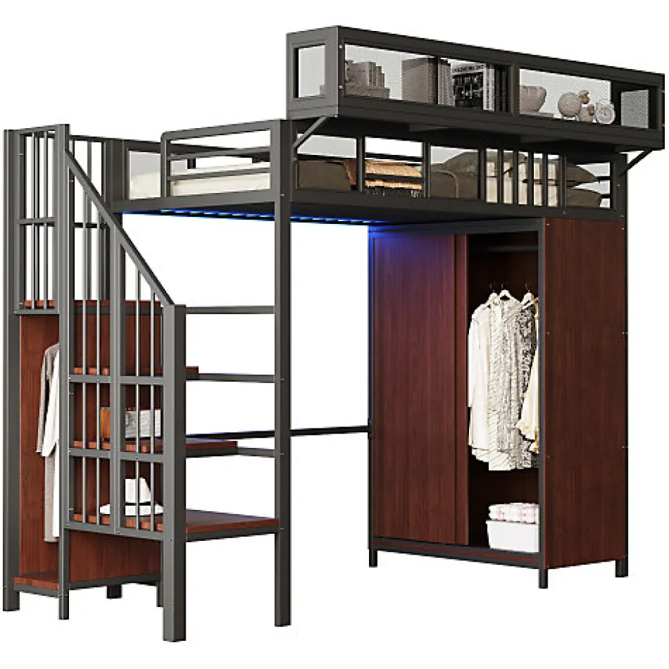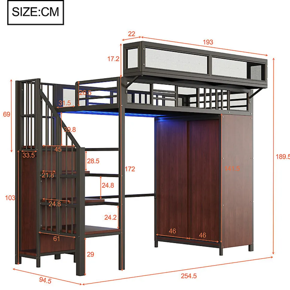 •【Design de rambarde remarquable】Ce lit mezzanine est doté d’une rambarde avant au design unique, combinant des panneaux en maille métallique et des barres horizontales et verticales, pour un style à la fois simple et original. Une étagère supplémentaire en maille métallique est intégrée à la rambarde, offrant un espace de rangement additionnel. Cette étagère est facilement amovible et installable selon vos besoins.•【Armoire intégrée】Ce lit mezzanine en métal est équipé d’une spacieuse armoire à portes coulissantes sur un côté, avec une tringle pour un rangement soigné et organisé de vos vêtements.•【Éclairage LED intelligent】Ce lit mezzanine en métal intègre une bande LED à couleurs changeantes sous le cadre de lit, vous permettant de personnaliser votre ambiance en changeant les couleurs selon vos envies.•【Échelle de rangement sécurisée】Ce lit en métal est équipé d’une échelle de sécurité sur un côté pour un accès facile au lit. L’espace de rangement supplémentaire sous l’échelle peut accueillir livres, jouets et autres objets. L’échelle comprend également une petite armoire, offrant un espace de rangement supplémentaire pour les vêtements ou les objets du quotidien.•【Conception gain de place】Ce lit mezzanine en métal intègre astucieusement l’espace de couchage et le rangement, tout en créant un espace ouvert spacieux en dessous. Cet espace multifonctionnel peut servir de bureau, de coin lecture ou de solution de rangement personnalisable.•【Structure métallique robuste】Ce lit en fer forgé possède une structure métallique de haute qualité, lui conférant une stabilité et une durabilité exceptionnelles. Le lit mezzanine allie avec élégance le métal et les panneaux de bois et est disponible en blanc ou en noir pour s’harmoniser parfaitement avec tous les styles de décoration intérieure.•【Facile à assembler】Des instructions détaillées et des pièces complètes sont disponibles pour vous aider à réaliser l’assemblage rapidement.