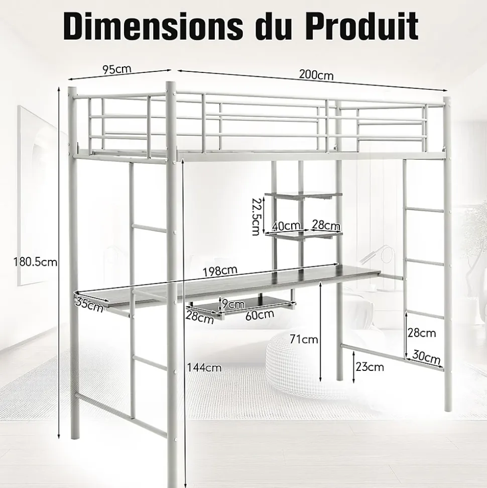 Spécifications:Couleur : Noir / Argenté/ BlancMatériau : Acier, MDFDimension du produit : 200 cm x 95 cm x 180,5 cm (L x l x h)Hauteur de l’espace sous le lit : 144 cmDimensions du bureau : 198 cm x 35 cm (L x l)Capacité de poids du lit : 150 kgCapacité de poids de la table : 40 kgCapacité de poids pour chaque étagère : 10 kgPoids net : 36 kgPoids brut : 40 kg
