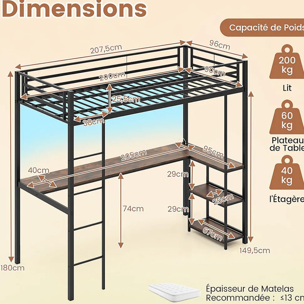 Matériau : Métal + MDFDimensions globales : 207,5 x 96 x 180 cm (L x l x H)Taille de matelas recommandée : 200 x 90 cm (L x l)Épaisseur de matelas recommandée : ≤ 13 cmOuverture du garde-corps : 38 x 25,5 cm (L x H)Hauteur de la plateforme du lit : 149,5 cmDimensions du bureau en L : 205 x 95 cm (L x l)Profondeur du plateau : 40 cmHauteur du plateau : 74 cmDimensions de l’étagère : 67 x 25 x 29 cm (L x l x H)Longueur du câble d’alimentation : 150 cmCapacité de poids du lit : 200 kgCapacité de poids du plateau : 60 kgCapacité de poids de l’étagère : 40 kgPoids net : 47,5 kgPrise AC : 250V/16APort USB : 5V/2A Livraison:1 x Lit mezzanine avec bureau1 x Manuel d’utilisation