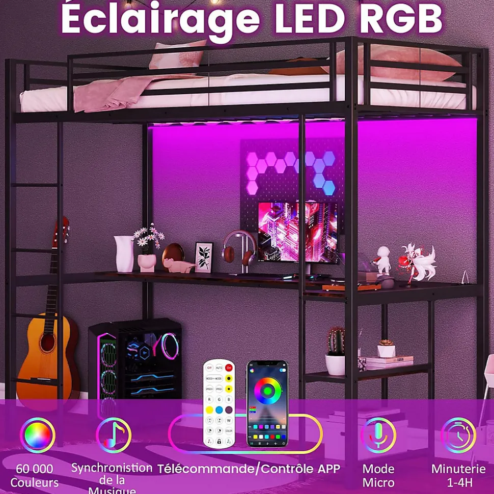 Transformez votre espace exigu en un havre d’efficacité et de style avec notre lit mezzanine multifonctionnel avec bureau !L’espace sous le lit dévoile un espace de travail productif avec un bureau en L et des stations de charge intégrées.Avec plus de 60 000 options de couleurs, contrôlez les lumières via une télécommande ou une application smartphone pour convenir à l’ambiance que vous souhaitez.