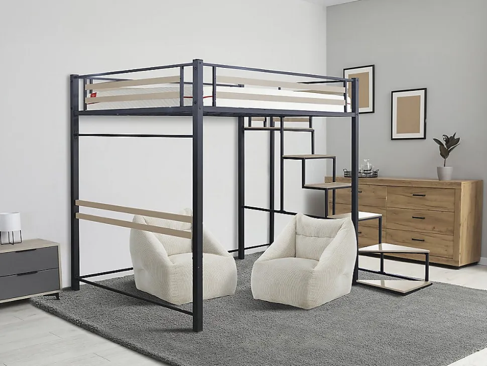 Lit mezzanine « LENA » avec escalier – 140 x 190 cm – Métal noirAlliant design contemporain et robustesse, ce lit mezzanine en métal noir apporte une touche sophistiquée à votre intérieur, tout en garantissant une durabilité exceptionnelle. Avec ses dimensions généreuses de 251 x 198 x 197 cm et un sommier spacieux de 140 x 190 cm, il offre un confort optimal pour deux personnes, tout en libérant un précieux espace au sol.Le design astucieux intègre un escalier sécurisé, pratique pour accéder facilement au couchage supérieur. L’espace dégagé sous le lit peut être aménagé selon vos besoins : bureau, coin détente ou rangement, pour un intérieur fonctionnel et organisé. Conçu pour répondre aux exigences du quotidien, ce lit supporte un poids maximal de 200 kg, tout en conservant une allure élégante et minimaliste.Transformez votre chambre avec le lit mezzanine « LENA » : une combinaison parfaite de style, de confort et d’efficacité. Commandez dès maintenant et redéfinissez votre espace de vie. Lit double mezzanine « LENA » – Dimension : 251 x 198 x 197 cm – Dimension sommier : 140 x 190 cm – Hauteur de couchage : 35 cm – Poids maximum supporté : 200 kg – Métal – Noir .Matières: MetalDescriptif: Lit double mezzanine LENA – Dimension : 251 x 198 x 197 cm – Dimension sommier : 140 x 190 cm – Hauteur de couchage : 35 cm – Poids maximum supporté : 75 kg – Métal – Noircouleur (filtre): NoirDimensions du couchage: 140 x 190 cmMatière(Filtre): MetalCouleurs: noirÉchelles: InclusDimensions: 251 x 198 x 197 cmLongueur: 251 cmhauteur: 197 cmLargeur: 198 cmHauteur de couchage: 35 cmPoids: 75,5 kgPoids maximum supporté: 200 kgle + produit: Gain d’espace Accessibilité facile RobusteConseils d’entretiens: Nettoyez-le avec un chiffon doux.Colisage: 2 colis : – 2 x 0,37 x 0,16 m, 40,5 kg – 1,5 x 0,51 x 0,14 m, 35 kg