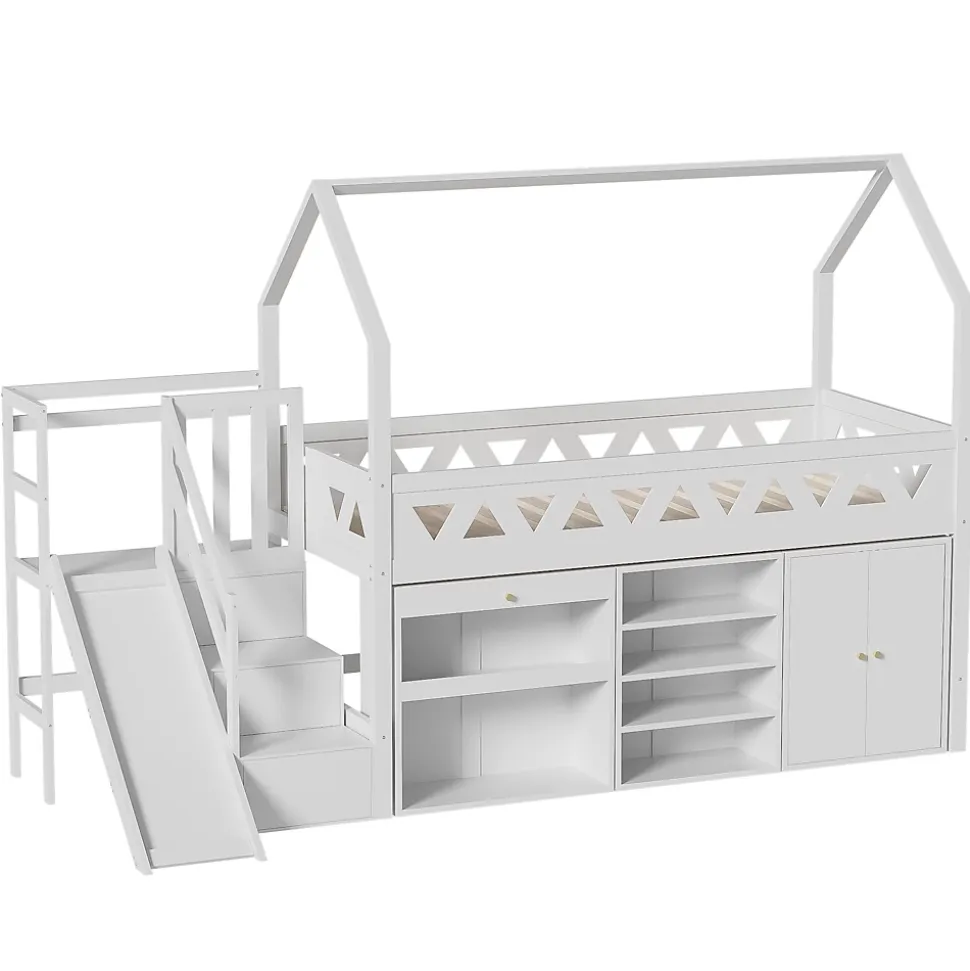 •【Design créatif】Ce lit superposé pour enfants est livré avec un toboggan et des escaliers, offrant aux enfants un espace supplémentaire pour jouer et faire de l’exercice, leur permettant de grandir sainement tout en jouant. Ce design créatif attire non seulement l’attention des enfants, mais stimule également leur imagination et leur créativité.•【Aspect blanc】Le blanc est une couleur vive et rafraîchissante qui donne aux gens une sensation de confort et de détente. Il est également plus facile à combiner avec une variété de styles de décoration pour rendre la pièce entière plus chaleureuse et plus confortable.•【Stockage】Le lit est équipé de tiroirs et d’armoires de rangement, permettant une utilisation efficace de l’espace et offrant un espace de rangement supplémentaire pour les jouets, les livres et les vêtements des enfants, gardant ainsi la pièce bien rangée.•【Matériaux de haute qualité】Le corps du lit est en bois massif, robuste et durable, possède une forte capacité de charge et une forte stabilité. La conception de la clôture assure la sécurité de l’enfant et peut être utilisée pendant une longue période.