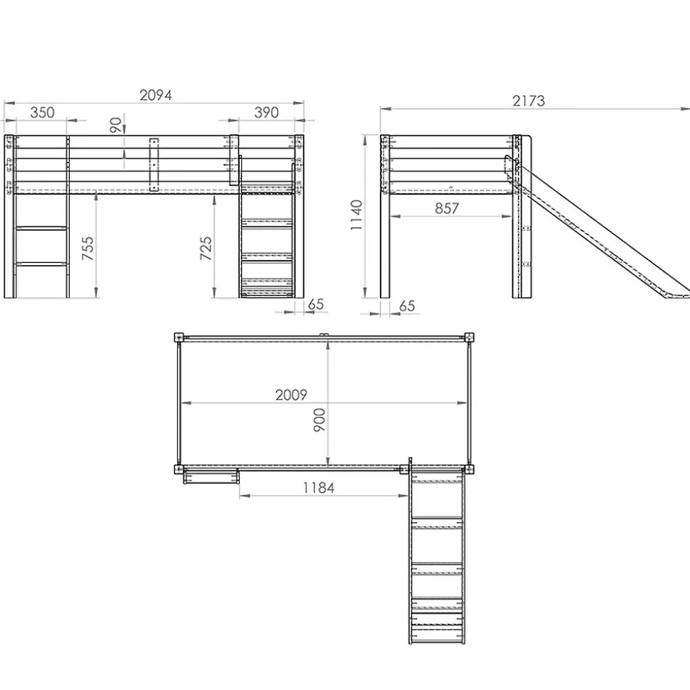 - Dimensions : Lit avec le toboggan : 209 x 217 x 114 cm – Lit : 209 x 105 x 114 cm – Couchage : 90 x 200 cm – Hauteur sous le lit : 72,5 cm – Textile : avant 195 x 75 cm et côté 85 x 75 cm