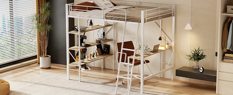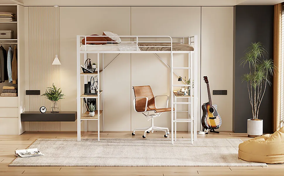 This loft bed provides a stylish and comfortable space for sleeping, studying, and working. With a spacious desk and three large shelves, it is perfect for homework, reading, writing, and more. The sturdy iron frame ensures strength, stability, and durability. The built-in ladder provides safe and easy access to the upper bed. Its minimalist, neutral design makes it suitable for all ages, and it’s perfect for maximizing space in smaller rooms.Features:Materials: Metal + MDFDimensions: 204.5 x 149 x 180.5 cmWeight Capacity: 120 kgRecommended Mattress Thickness: 10-15 cmNumber of Slats: 24Assembly Required: YesOrigin: ChinaBenefits:Durable Construction: Sturdy steel frame and robust MDF ensure long-lasting use.Functional Design: Includes a desk and three large shelves for work and storage.Space-Saving: Ideal for small spaces, providing sleeping and working areas in one.Safety: The upper bed is surrounded by strong guardrails for added security.Delivery: Ships in two packages from Germany. Delivery may vary.