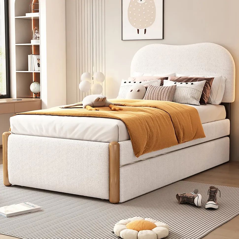 Dimensions totales :201x91x119cm(LxLxH)Capacité de charge :150 kgCouleur :blancMatériau :Peluche+Panneau composite de fibres de bois à densitéNombre de paquets : 2Poids net :35.00kgMontage nécessaire : OuiMatelas inclus : NonMatériaux de haute qualité:Ce lit est fabriqué en polaire de haute qualité et en Panneau composite de fibres de bois à densité, ce qui le rend confortable et doux au toucher et lui confère la plus grande chaleur.Style simple et élégant:Le design général du lit est simple et élégant avec des lignes douces, ce qui correspond à la tendance esthétique des maisons modernes. La tête de lit blanche avec des décorations en bois à l’extrémité du lit souligne la beauté des détails et donne à l’ensemble de la chambre un aspect chaleureux et douillet.Lit gigogne pratique:Ce lit est équipé d’un lit gigogne extractible qui peut être installé à gauche ou à droite, ce qui permet aux utilisateurs de faire des ajustements flexibles en fonction de leurs besoins. Que vous montiez et descendiez du lit du côté gauche ou du côté droit, il est facile à manipuler et augmente la commodité et le confort du lit.Facile à installer:Des instructions détaillées et des pièces complètes peuvent vous aider à terminer l’installation rapidement. Le plaisir de l’installation vous permet d’apprécier encore plus le lit.Le lit est expédié en deux colis depuis l’Allemagne, parfois les colis arrivent à des dates différentes, mais aussi pour s’assurer que vos attentes sont satisfaites, s’il vous plaît soyez patient ou contactez notre service clientèle amical.Remarques:En raison des mesures manuelles, une erreur de 2 à 3 cm peut se produire.En raison de la lumière, il peut y avoir des différences de couleur entre l’image du produit et le produit réel.Veuillez vous référer au produit que vous avez réellement reçu.