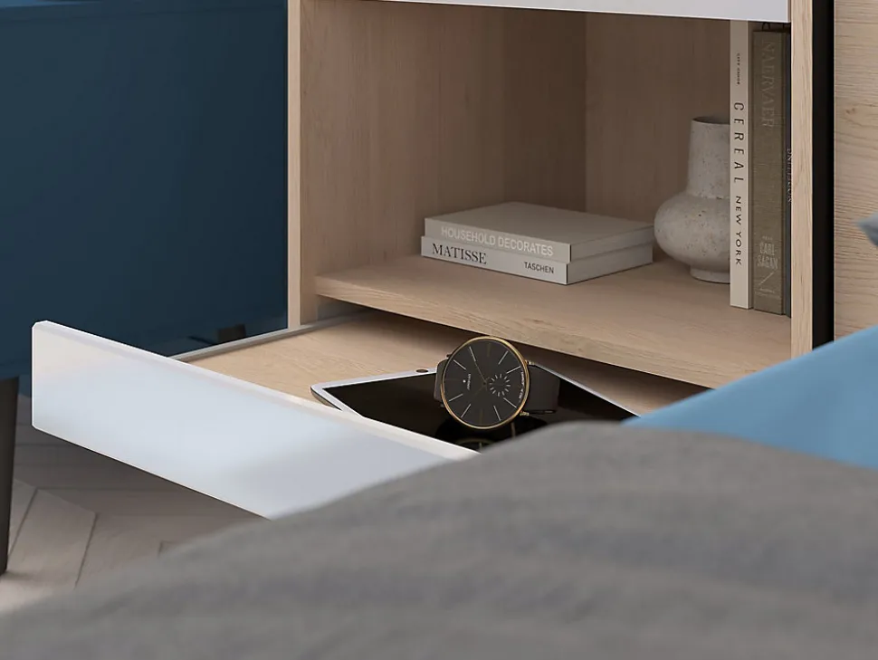 - LEDs intégrées, Branchement USB-C intégré, Chevet intégré, Penderie intégrée, Création exclusive
