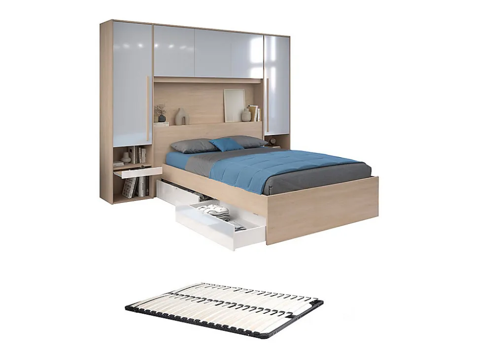 Laissez-vous tenter par le charme naturel des produits VELONA qui apporteront une touche de modernité à votre chambre. Ses nombreux rangements vous permettront de gagner de la place dans votre pièce. Le pont de lit VELONA se révèle être multifonctions. Ses tablettres coulissantes au niveau des niches vous permettront de créer une table de chevet de chaque côté du lit. De plus, VELONA est équipé de nombreuses étagères et d’une penderie afin de vous permettre de ranger vos vêtements à l’abris de la poussière. Le lit possède quant à lui 2 tiroirs sous sa structure afin de vous offrir un gain de place supplémentaire. Pour finir, le lit VELONA est équipé de LEDS, idéal pour créer une ambiance cocooning pour votre lecture du soir par exemple !Caractéristiques Couleur (nuance) : Blanc, Naturel clair Matière (précision) : Panneau de particule Finition : Mélaminé Taille (couchage) : 140 x 190 cm Nombre de places : 2 places Avec leds Couleur des LEDs : Multicolore Type de commande : Télécommande Type de branchement : Prise USB Sans matelas Avec sommier Type de sommier : Cadre à lattes Avec chevet Type de rangement : 2 tiroirs, 4 niches, Tablette, Etagère, 1 penderie Nombre d’étagères : 9 3 tablettes Tiroir coulissant Gamme : Création Exclusive À monter soi-même : 2 tablettes coulissantes au niveau des chevets : Ce lit est compatible avec tous les matelas 140×190 cmDimensions Longueur : 265.2 cm Hauteur : 202.8 cm Profondeur : 233 cm Hauteur de couchage : 39.7 cmLivraisonLors de la livraison, il est conseillé de vérifier que le bon nombre de colis a été livré.ColisColis n°1 : Longueur 198 cm, Largeur 84 cm, Hauteur 6 cm, Poids 33 kg, Colis n°2 : Longueur 101 cm, Largeur 50 cm, Hauteur 6 cm, Poids 14 kg, Colis n°3 : Longueur 146 cm, Largeur 48 cm, Hauteur 10 cm, Poids 34 kg, Colis n°4 : Longueur 209 cm, Largeur 50 cm, Hauteur 6 cm, Poids 27 kg, Colis n°5 : Longueur 174 cm, Largeur 62 cm, Hauteur 5 cm, Poids 32 kg, Colis n°6 : Longueur 211 cm,