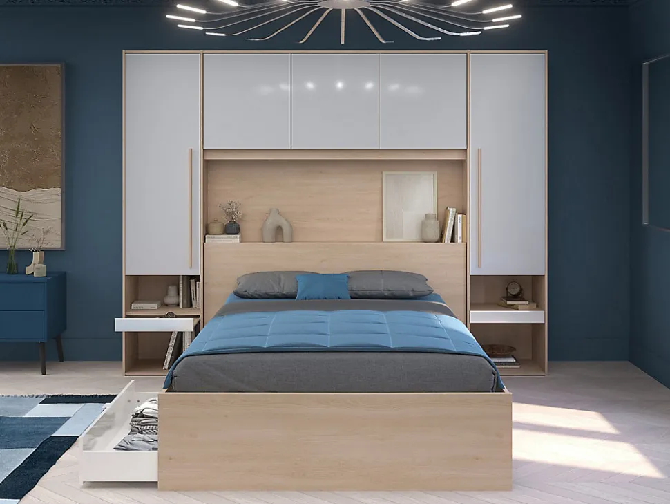 Laissez-vous tenter par le charme naturel des produits VELONA qui apporteront une touche de modernité à votre chambre. Ses nombreux rangements vous permettront de gagner de la place dans votre pièce. Le pont de lit VELONA se révèle être multifonctions. Ses tablettres coulissantes au niveau des niches vous permettront de créer une table de chevet de chaque côté du lit. De plus, VELONA est équipé de nombreuses étagères et d’une penderie afin de vous permettre de ranger vos vêtements à l’abris de la poussière. Le lit possède quant à lui 2 tiroirs sous sa structure afin de vous offrir un gain de place supplémentaire. Pour finir, le lit VELONA est équipé de LEDS, idéal pour créer une ambiance cocooning pour votre lecture du soir par exemple !Caractéristiques Couleur (nuance) : Blanc, Naturel clair Matière (précision) : Panneau de particule Finition : Mélaminé Taille (couchage) : 140 x 190 cm Nombre de places : 2 places Avec leds Couleur des LEDs : Multicolore Type de commande : Télécommande Type de branchement : Prise USB Sans matelas Avec sommier Type de sommier : Cadre à lattes Avec chevet Type de rangement : 2 tiroirs, 4 niches, Tablette, Etagère, 1 penderie Nombre d’étagères : 9 3 tablettes Tiroir coulissant Gamme : Création Exclusive À monter soi-même : 2 tablettes coulissantes au niveau des chevets : Ce lit est compatible avec tous les matelas 140×190 cmDimensions Longueur : 265.2 cm Hauteur : 202.8 cm Profondeur : 233 cm Hauteur de couchage : 39.7 cmLivraisonLors de la livraison, il est conseillé de vérifier que le bon nombre de colis a été livré.ColisColis n°1 : Longueur 198 cm, Largeur 84 cm, Hauteur 6 cm, Poids 33 kg. Colis n°2 : Longueur 101 cm, Largeur 50 cm, Hauteur 6 cm, Poids 14 kg. Colis n°3 : Longueur 146 cm, Largeur 48 cm, Hauteur 10 cm, Poids 34 kg. Colis n°4 : Longueur 209 cm, Largeur 50 cm, Hauteur 6 cm, Poids 27 kg. Colis n°5 : Longueur 174 cm, Largeur 62 cm, Hauteur 5 cm, Poids 32 kg. Colis n°6 : Longueur 211 cm,