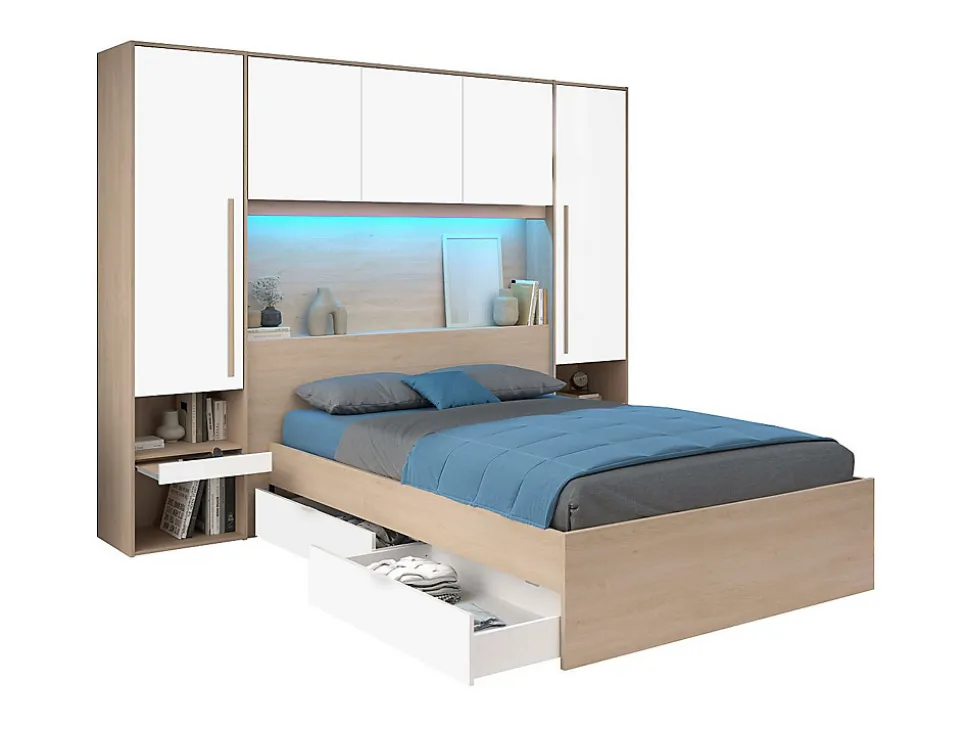 - Lit avec rangements – 140 x 190 cm – Avec LEDs + Sommier – Structure : Panneaux de particules – Coloris : Naturel et blanc brillant – Dimensions : L265,2 x P233 x H202,8 cm – Style : Moderne – Avec VELONA vous êtes sûr de faire le bon choix !