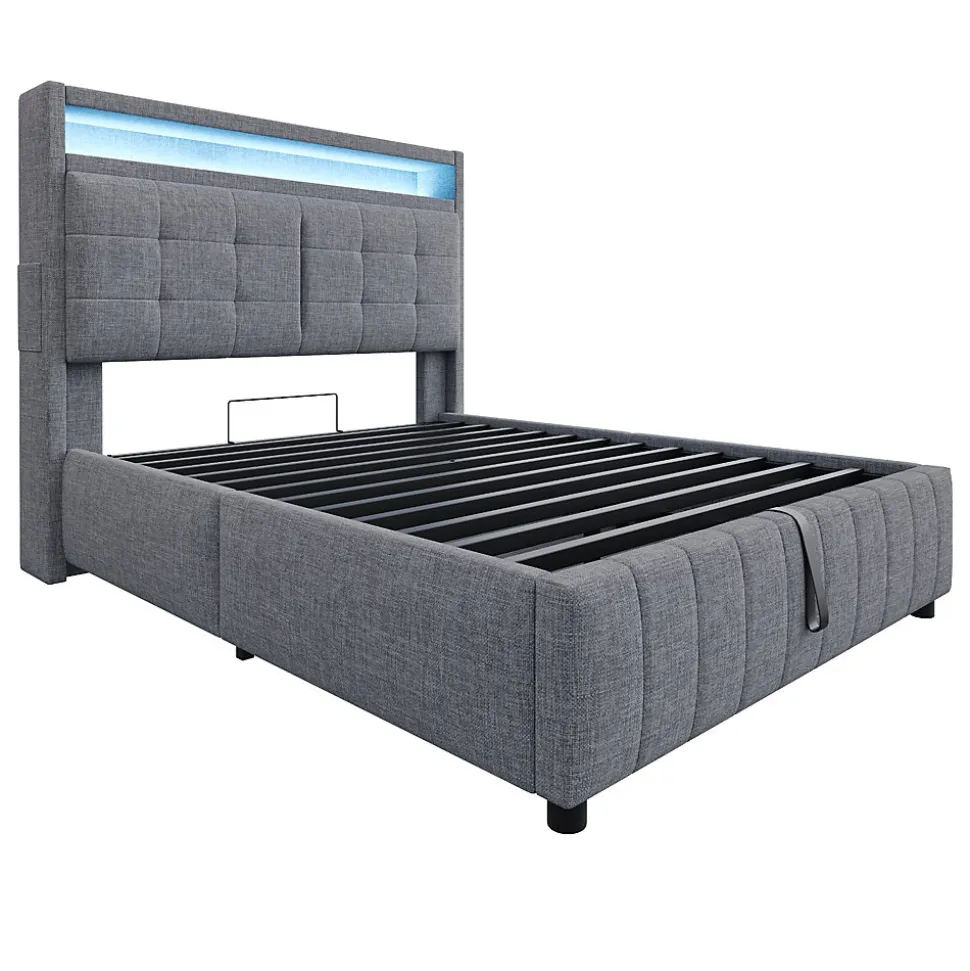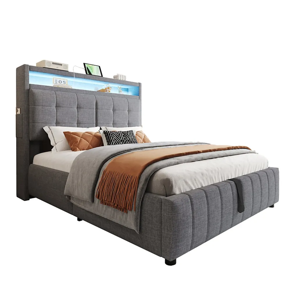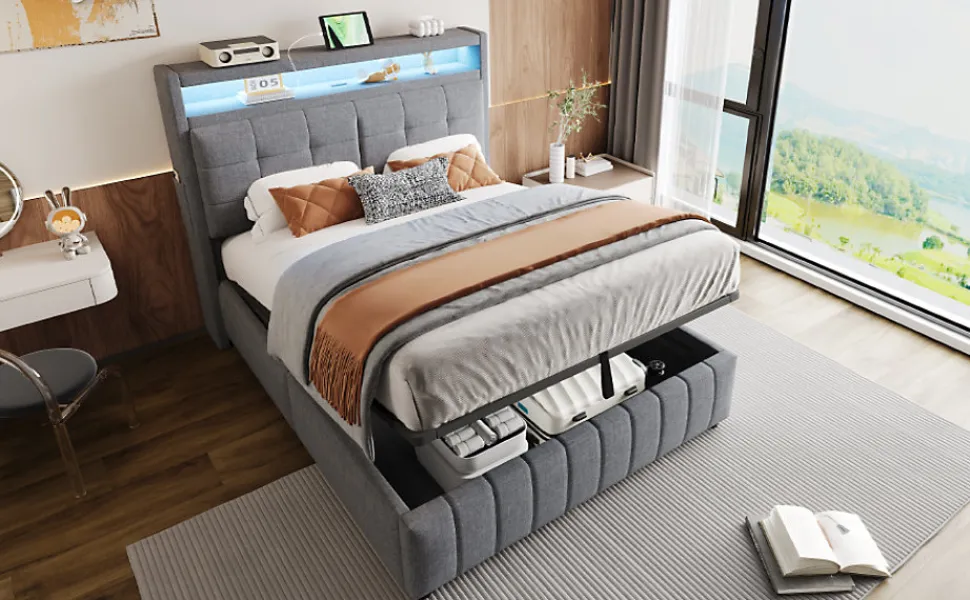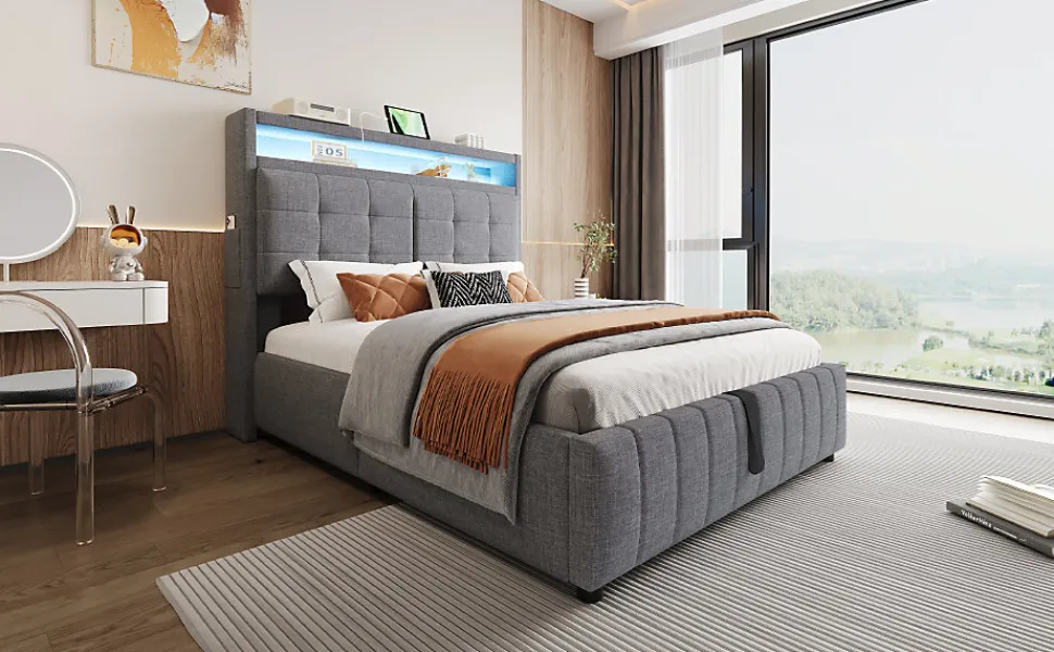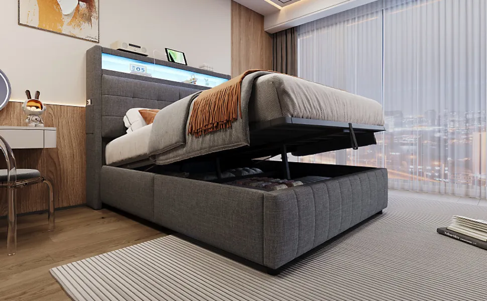 Design classique et pratiqueCe lit rembourré est revêtu d’un tissu en lin et présente une tête de lit au motif chevron pour un style moderne et épuré. La tête de lit intègre des étagères et de petits compartiments latéraux, idéals pour ranger et organiser vos objets personnels.Éclairage LED multicolore et port USBLa tête de lit est équipée d’un système d’éclairage LED à couleurs variables, créant une atmosphère chaleureuse et élégante dans votre chambre. Le port USB intégré vous permet de recharger facilement vos appareils pendant la nuit.Grand espace de rangement hydrauliqueLe compartiment de rangement caché sous le lit offre un vaste espace pour stocker la literie, les coussins ou d’autres articles essentiels, gardant votre chambre bien ordonnée.Tissu en lin respirantLe tissu en lin gris, à la fois doux et résistant, apporte une touche moderne et confortable, s’adaptant parfaitement à tout style de décoration intérieure.Structure métallique stable et durableLa conception robuste du cadre en métal assure une excellente stabilité et une longue durée de vie, garantissant un sommeil paisible et sécurisé chaque nuit.