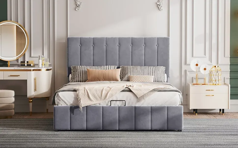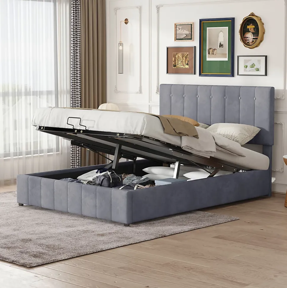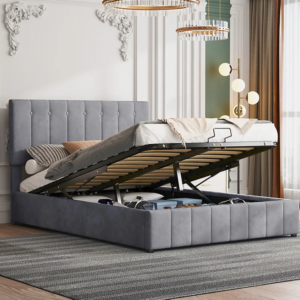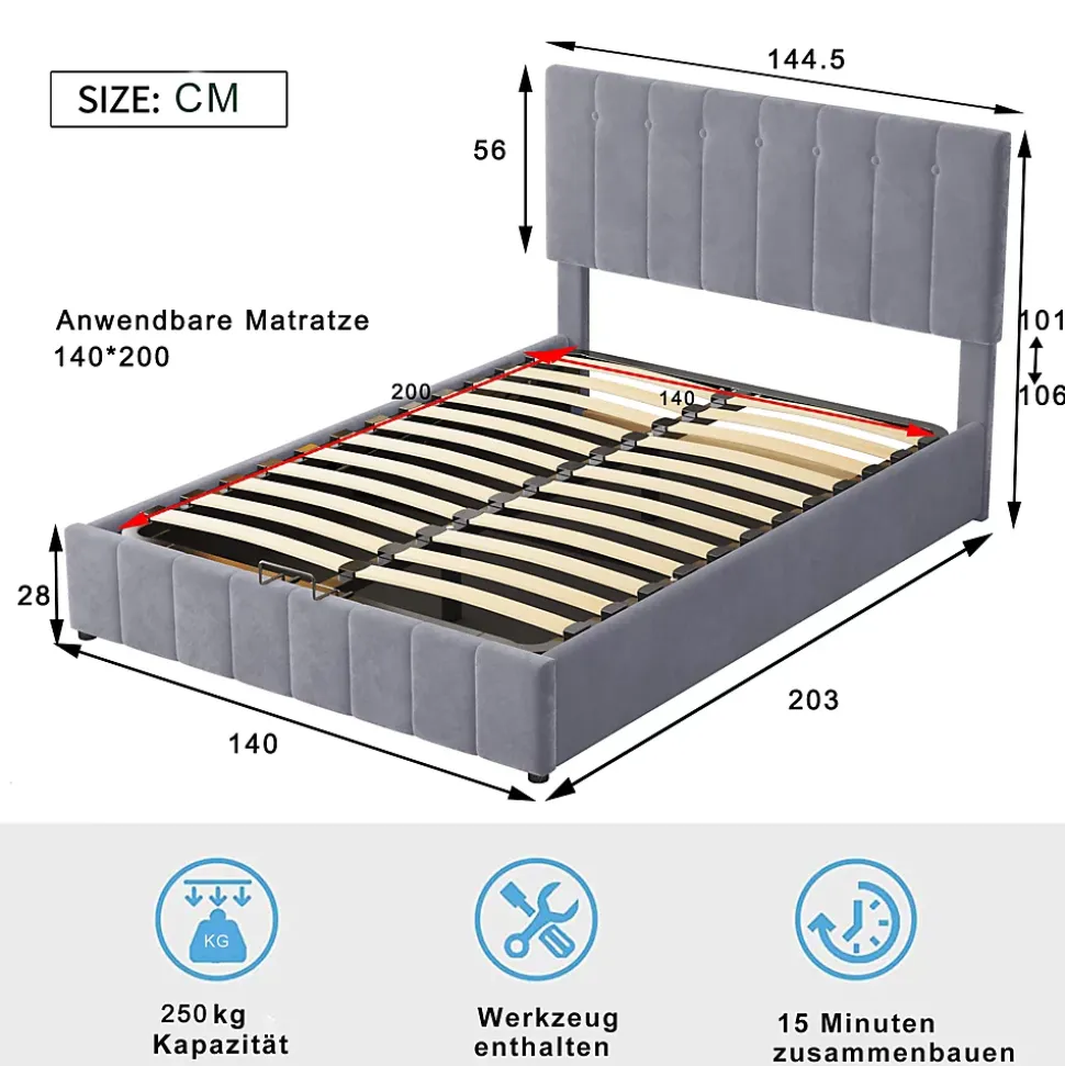Gain de place et rangement pratique28 cm d’espace utilisable sous le sommier offrant un volume équivalent à une armoire à deux portes, idéal pour les petites maisons ou appartements.Ouverture facileLe lit rembourré avec fonction de levage hydraulique permet un accès aisé au rangement sous le lit sans déplacer le matelas ni effort supplémentaire.Durable et stableSommier métallique avec 24 lattes doubles incurvées pour un soutien optimal du matelas, garantissant confort et maintien, et évitant l’affaissement.Tissu en velours douxRevêtement en velours de qualité, doux et confortable, apportant chaleur et élégance à la chambre. Plusieurs couleurs disponibles pour s’adapter à tous les styles.Montage simpleDimensions totales 203 x 140 x 106 cm, charge maximale 250 kg. Livré en deux colis depuis l’Allemagne avec toutes les pièces, outils et instructions inclus.