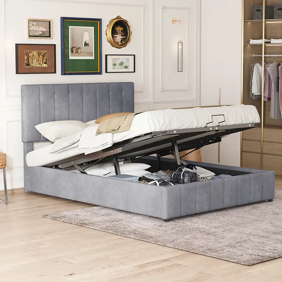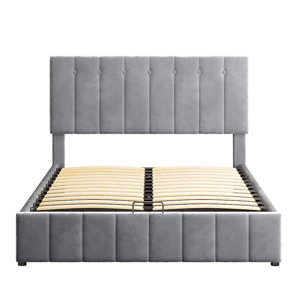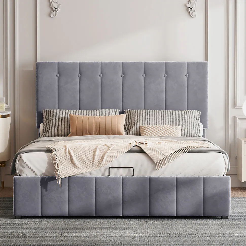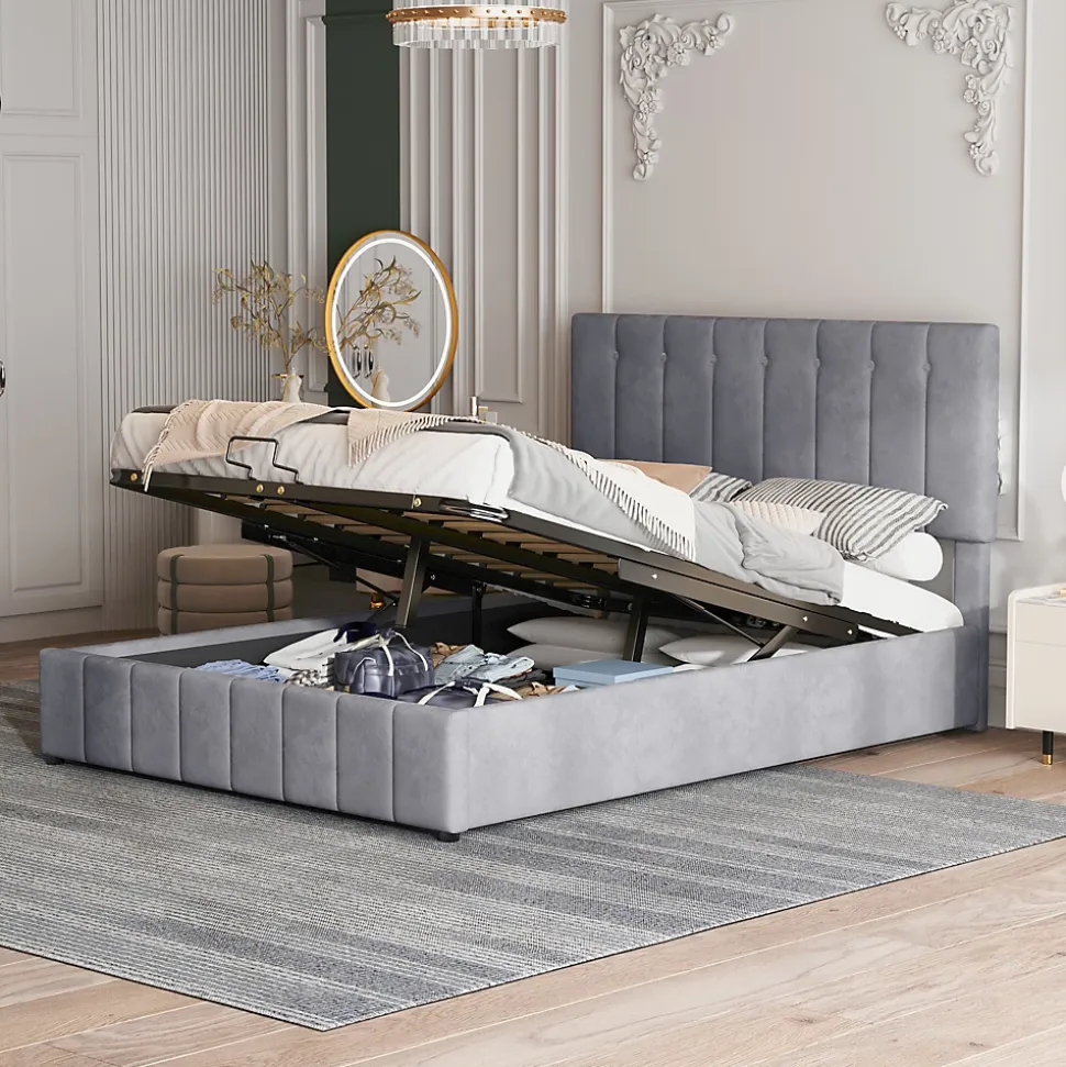Gain de place et rangement pratique28 cm d’espace utilisable sous le sommier offrant un volume équivalent à une armoire à deux portes, idéal pour les petites maisons ou appartements.Ouverture facileLe lit rembourré avec fonction de levage hydraulique permet un accès aisé au rangement sous le lit sans déplacer le matelas ni effort supplémentaire.Durable et stableSommier métallique avec 24 lattes doubles incurvées pour un soutien optimal du matelas, garantissant confort et maintien, et évitant l’affaissement.Tissu en velours douxRevêtement en velours de qualité, doux et confortable, apportant chaleur et élégance à la chambre. Plusieurs couleurs disponibles pour s’adapter à tous les styles.Montage simpleDimensions totales 203 x 140 x 106 cm, charge maximale 250 kg. Livré en deux colis depuis l’Allemagne avec toutes les pièces, outils et instructions inclus.