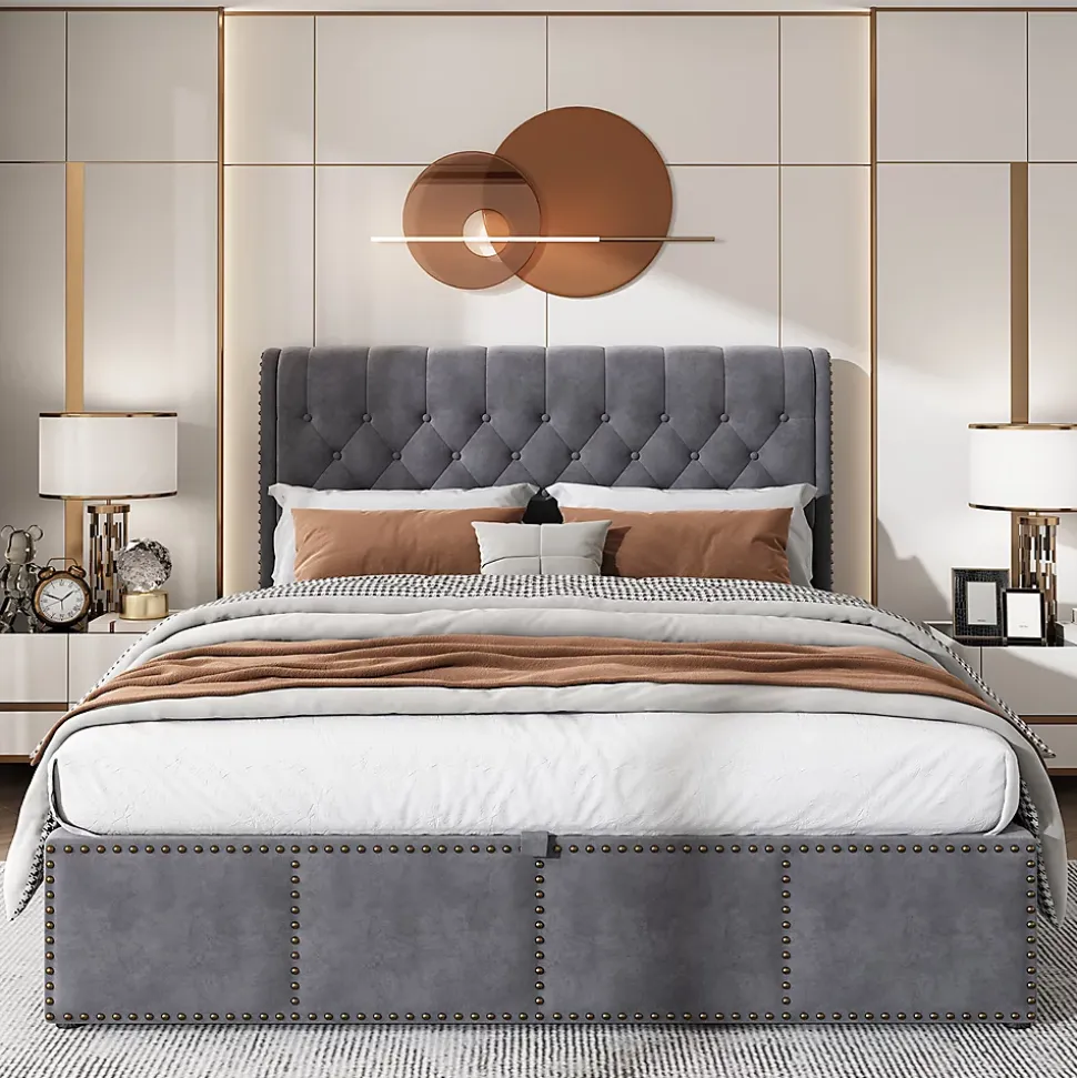 Dimensions du produit : 197x141x103cm(LxPxH)Note sur les dimensions : Toutes les dimensions sont approximativesCouleur principale : GrisMatériau principal : veloursType de sommier : Un sommier est inclus dans la livraisonCapacité de charge maximale : 300kgDétails de l’espace de rangement : Rangement des tiroirs du litType de matelas : sans matelasPoids net : 45.3 kgNombre de paquets : 2Aspect personnalisé et élégant:Le style minimaliste européen fait que ce lit respire l’élégance et ajoute une touche de style à votre chambre, convenant à la décoration de la maison.Soutien doux et confortable:Avec une hauteur de 103 cm, la tête de lit est non seulement robuste mais aussi douce et confortable, offrant à votre corps un soutien confortable lorsque vous vous appuyez dessus.Fonction de rangement puissante:Le coffre de lit est pratique, facile à nettoyer et offre un espace de rangement pour vos affaires, ce qui permet de garder votre chambre propre et confortable.Design personnalisé des rivets:L’extrémité du lit est ornée de rivets, ce qui est très personnalisé et ajoute de la variété à votre chambre.Facile à assembler:Le design du lit est simple et élégant, et il est facile à assembler en suivant les instructions, ce qui vous permet de gagner un temps précieux. Si vous rencontrez des problèmes pendant le processus d’assemblage, veuillez nous contacter à temps.Remarques :※ En raison de la lumière, il peut y avoir des différences de couleur entre l’image du produit et le produit réel, veuillez vous référer au produit réel que vous recevez.※ Ce produit sera divisé en deux colis pour la livraison. Il se peut qu’ils n’arrivent pas en même temps. Veuillez patienter.※ Si le client a des questions pendant l’installation, veuillez nous contacter dès que possible.