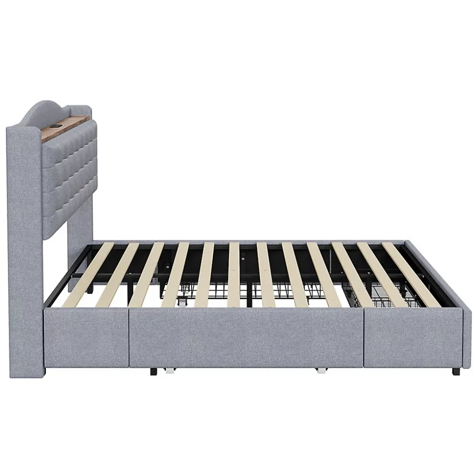 Lit polyvalent – Ce lit double rembourré est équipé d’un port de chargement USB intégré et d’un plateau au niveau de la tête de lit, vous permettant d’emporter facilement vos appareils et autres objets.Tissu en lin – Ce lit doux est enveloppé dans un élégant tissu en lin, qui est doux pour la peau et respirant, résistant à l’usure et déperlant, ajoutant une touche de sophistication à votre chambre.Grand espace de rangement – Ce lit plat est doté de quatre tiroirs surdimensionnés offrant beaucoup d’espace pour le linge de lit et les vêtements.Solide et robuste – La structure du cadre de ce lit plat est constituée de lattes en bois et de clips en métal, soutenus par de solides pieds en métal croisés capables de supporter une charge allant jusqu’à 300 kg. Il vous offre un environnement de sommeil confortable et sécurisé.Poids & Dimensions :Dimensions totales du produit : 200 x 146 x 110 cmDétails des dimensions du produit : Veuillez consulter l’image des taillesNombre de colis : 2Poids total du produit : 45 kgCapacité de poids : 300 kgÉpaisseur de matelas recommandée : 22-27 cmSpécifications :Type de produit : Lit modulaireTaille : 140 x 200 cmMatériau du produit : Tissu en lin + Métal + Contreplaqué + MDFNiveau de montage : Montage complet requis/Montage partielPoids total du colis : 47,6 kgNombre de lattes : 12Nombre de personnes recommandé : 2Outils supplémentaires requis : Tous les outils inclus/VisseuseÉvitez les outils électriques : Oui