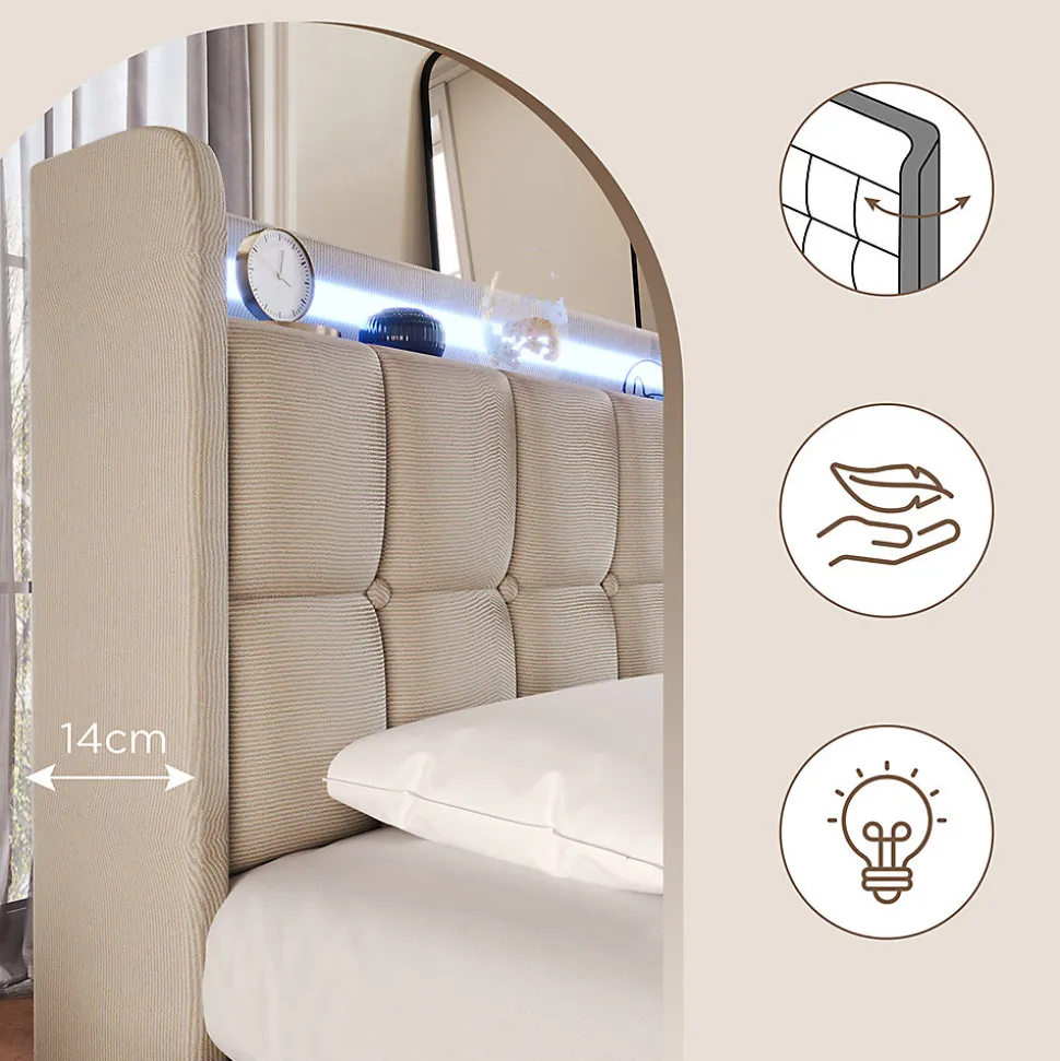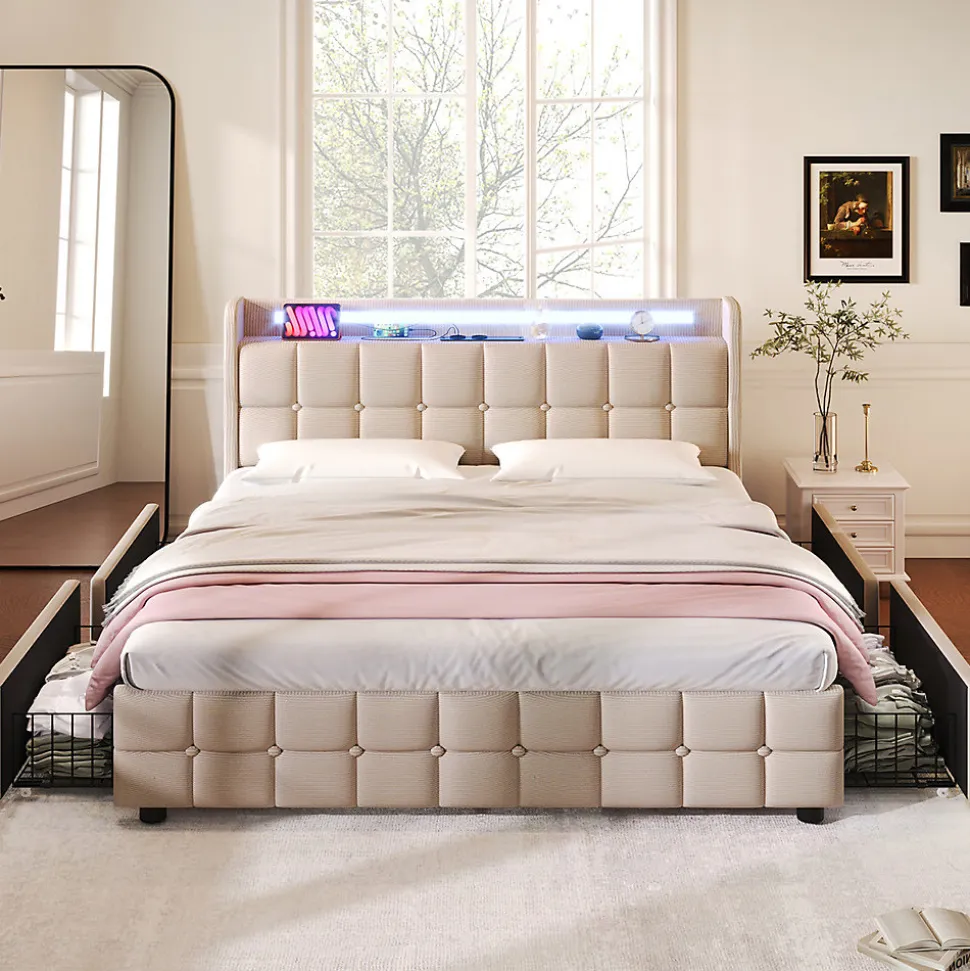 Dimensions totales :220×144.5x103cm(LxLxH)Capacité de charge :600LBSCouleur :BeigeMatériau :lin+FerNombre de paquets : 2Poids net :48.00kgMontage nécessaire : OuiMatelas inclus : NonTête de lit avec prises de courant et ports USB : L’une des caractéristiques les plus pratiques est la prise intégrée à la tête du lit, que vous pouvez utiliser pour recharger votre téléphone portable et votre tablette avant de vous coucher. Chaque prise est équipée de deux ports de charge aux normes européennes et de deux ports USB.Éclairage LED : L’éclairage LED ajoute un style moderne à votre chambre à coucher. Grâce à la télécommande, vous pouvez changer les différentes couleurs et la luminosité pour un couchage confortable.Rangement : Le lit est équipé de 4 tiroirs de grande capacité. Deux côtés du lit sont équipés de boucles de tiroir, qui permettent de fixer fermement le tiroir au lit lorsqu’il n’est pas utilisé, afin de garder votre chambre à coucher bien rangée. Les boîtes de rangement sont faciles à sortir et à rentrer grâce aux roulettes de la base.La praticité rencontre le design : Le lit harmonise habilement un design élégant et un confort maximal. Les boutons décoratifs affinent la tête de lit et lui donnent une touche moderne.Le cadre du lit est principalement en fer, il est durable et a une capacité de charge allant jusqu’à 600 LBS.Les pieds de soutien supplémentaires du pôle central peuvent assurer la stabilité fiable du lit.Informations détaillées : Pour réduire le risque de dommages, ce cadre de lit est expédié dans 2 boîtes et ils peuvent arriver à des jours différents. Si les deux colis sont arrivés mais qu’il manque des pièces, veuillez contacter le service client et si vous déplacez le lit, veuillez le soulever au lieu de le traîner sur le sol.Remarques :En raison des mesures manuelles, une erreur de 2 à 3 cm peut se produire.