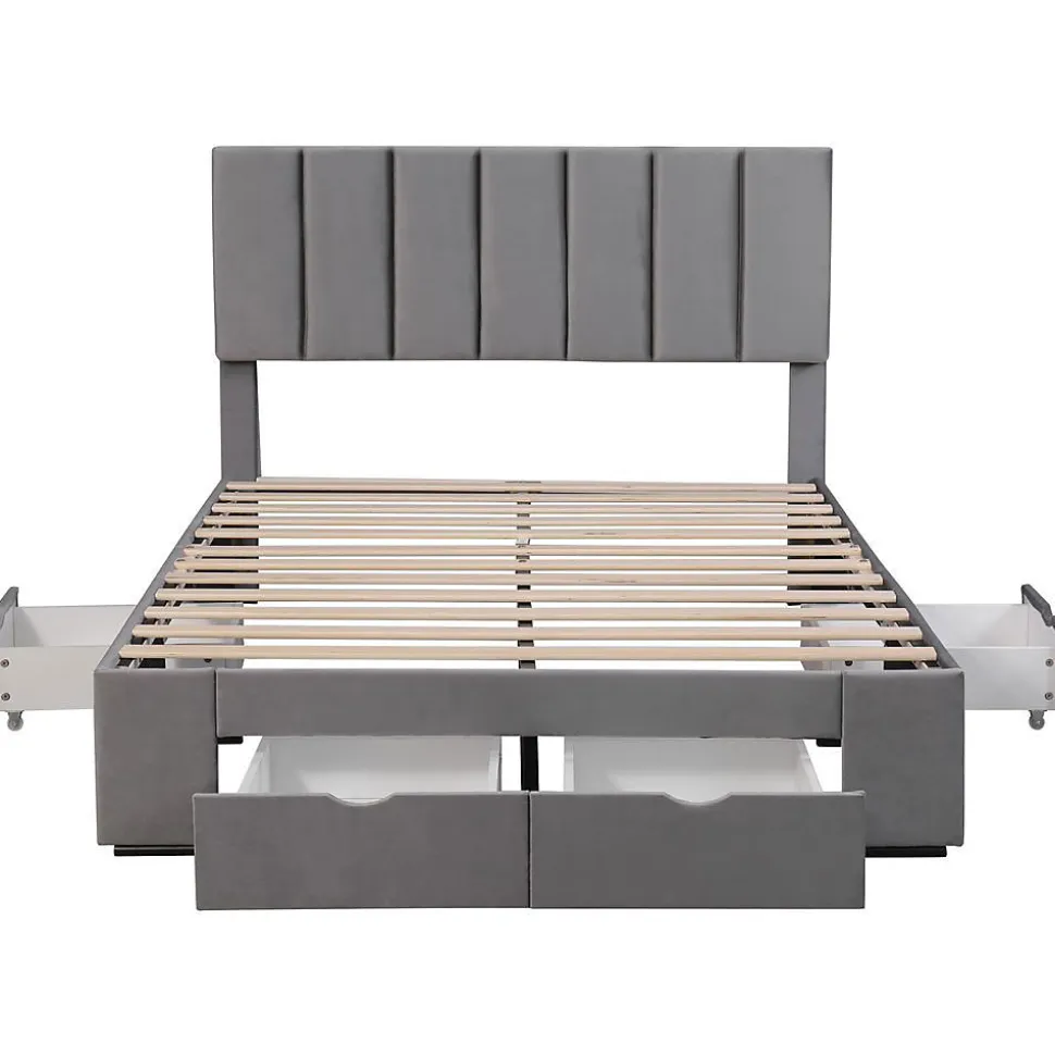 Lit rembourré velours 140×200 cm avec rangements – GrisConfort & fonctionnalité :Velours doux : Texture haut de gamme et agréable au toucher4 tiroirs pratiques : Rangements spacieux sur roulettesTête de lit réglable : Hauteur adaptable pour plus de confortStructure robuste : Sommier à lattes inclus (220 kg max)Détails techniques :Dimensions : 203,5×142 cm (surface couchage 140×200 cm)Livraison : 2 colis (24,9 kg + 24,2 kg)Montage : Simple avec notice claireIdéal pour : Chambres élégantes avec besoin de rangement