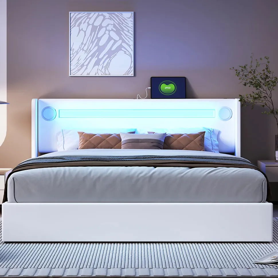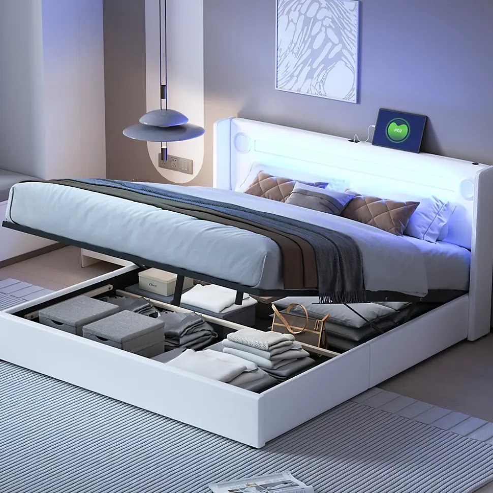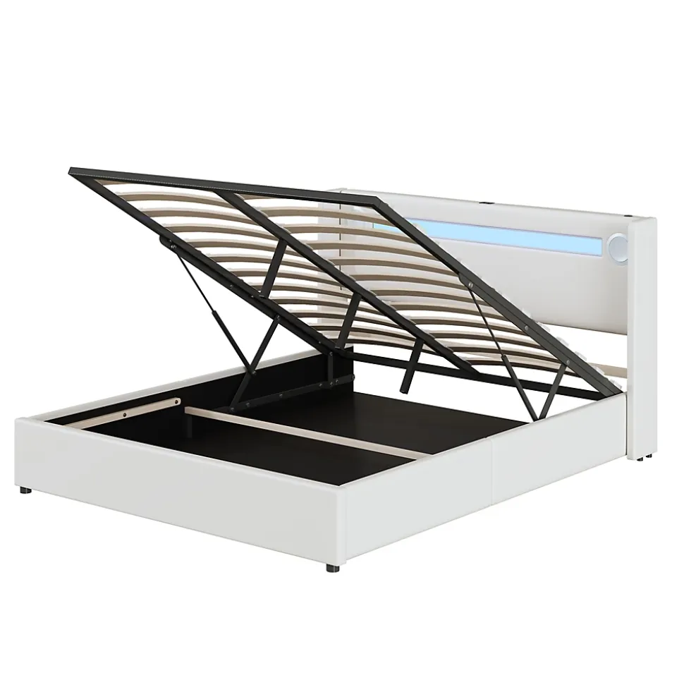 Lit en cuir PUCe lit est fabriqué en cuir synthétique PU, résistant à l’eau et à la saleté, et facile à nettoyer. Son design élégant offre confort et modernité à votre chambre.Lit multifonction avec technologie intégréeÉquipé d’un lecteur Bluetooth et de 2 ports USB, ce lit permet d’écouter de la musique depuis votre téléphone tout en rechargeant vos appareils. La bande LED s’allume au rythme de la musique pour créer une atmosphère relaxante.Grand espace de rangementGrâce au mécanisme hydraulique à double levage, ce lit offre un vaste espace de rangement sous le sommier, idéal pour les appartements ou chambres avec espace limité.Structure robuste et durableLe cadre en acier et le système de lattes en bois assurent stabilité et durabilité. Le lit peut supporter jusqu’à 300 kg sans sommier supplémentaire, garantissant un usage sûr et silencieux.Montage facile et livraison en plusieurs colisDimensions : 212,5 x 166 x 103 cm. Le lit est expédié depuis l’Allemagne en 2 colis, pouvant arriver à des dates différentes. Merci de patienter 2 à 3 jours ou de contacter le service client pour toute assistance.