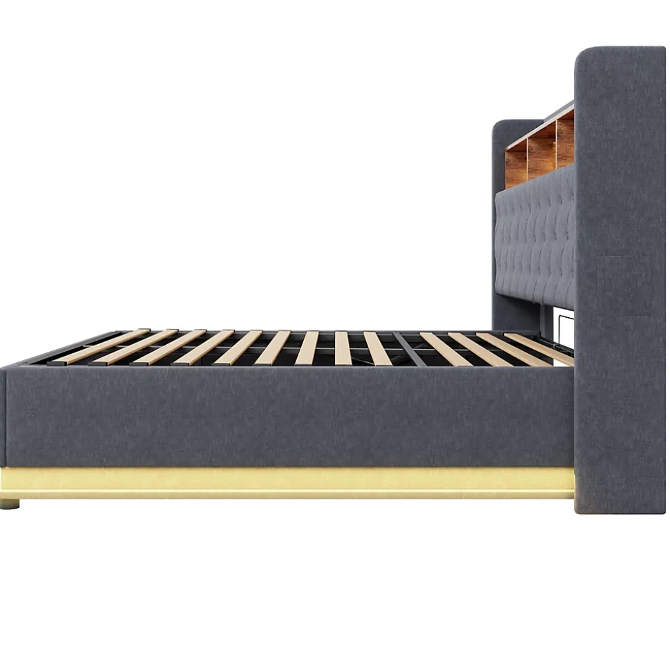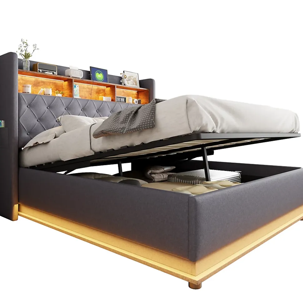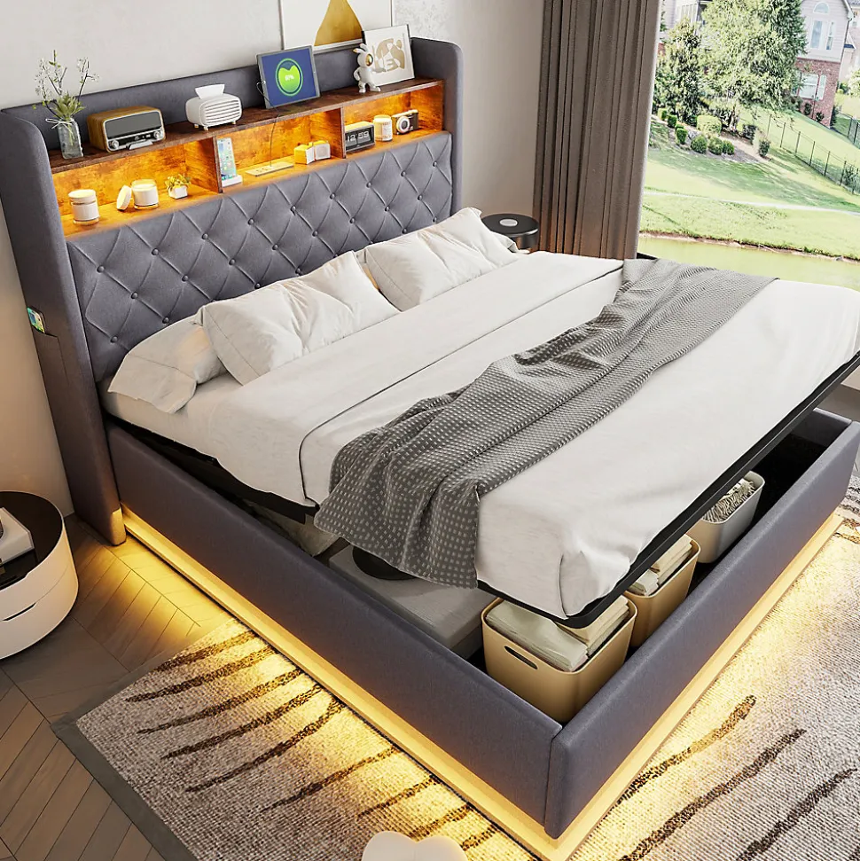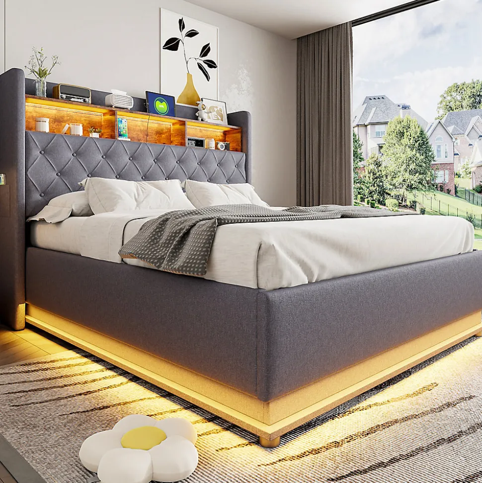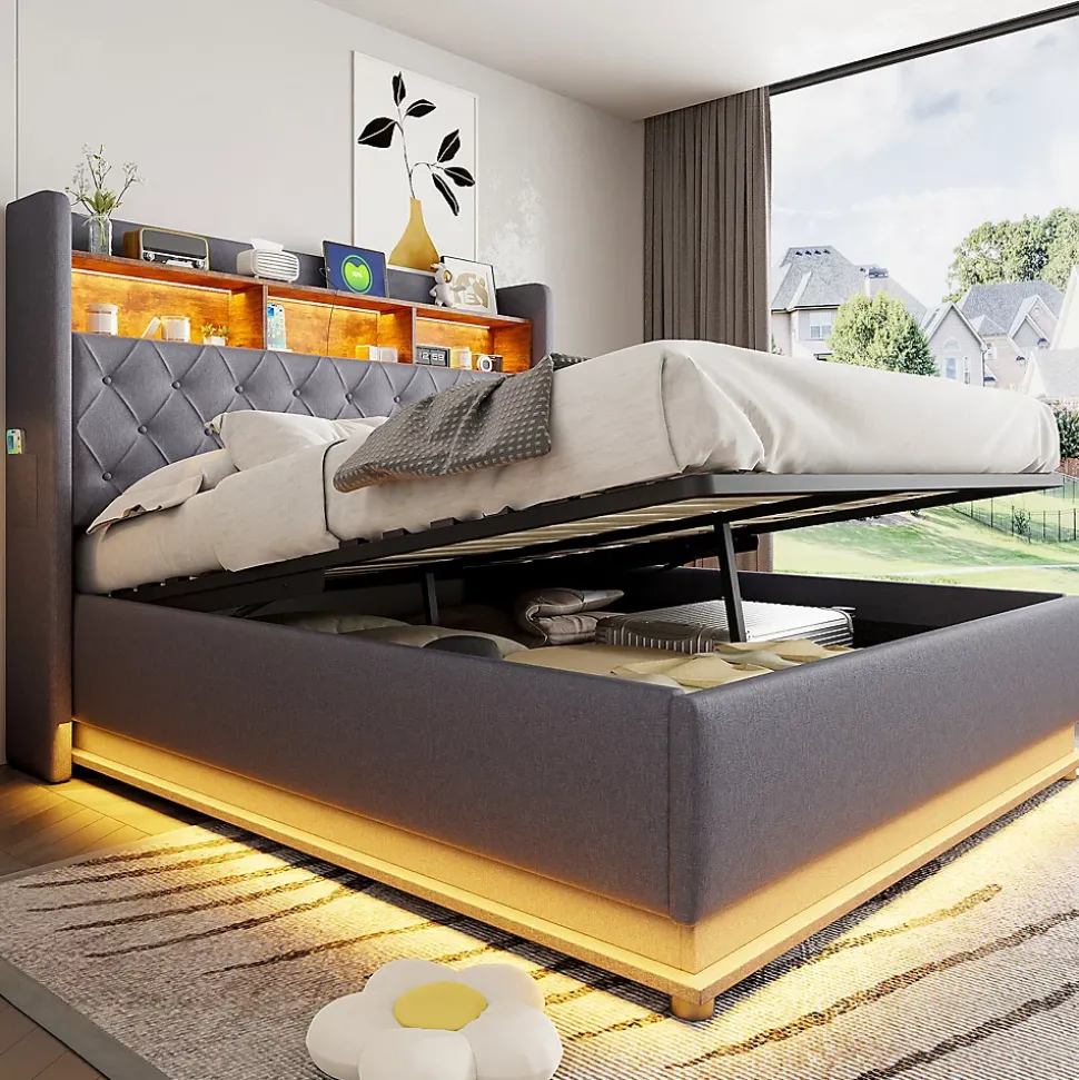 LED multicoloreCe lit est équipé de bandes LED à la tête et autour du lit, pouvant changer de couleur pour créer une atmosphère relaxante et agréable.Prise USB pratiqueLe lit rembourré LED dispose d’une prise USB intégrée, idéale pour recharger vos appareils tout en lisant ou en vous relaxant, alliant style et fonctionnalité.Multiples espaces de rangementCe lit propose un rangement à la tête ainsi qu’un rangement hydraulique sous le lit, optimisant l’espace de la chambre et offrant beaucoup de place pour literie, couvertures et autres objets.Structure métallique stableLe cadre en métal robuste avec lattes en bois multicouches assure stabilité et durabilité, garantissant chaque nuit un soutien confortable pour un sommeil réparateur.Lin durableProfitez du tissu en lin luxueux, doux au toucher, résistant et durable, qui conserve son aspect élégant même après une utilisation prolongée.