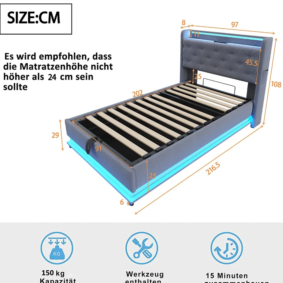 Design multifonctionnelChargez votre téléphone, tablette et autres appareils sans quitter le lit. Ce lit rembourré dispose d’étagères, d’une tête relevable, d’un éclairage LED, de 3 ports USB et d’un port Type-C. Les poches pratiques sur les côtés permettent de garder votre téléphone et vos petits objets à portée de main.Éclairage LED multicoloreCe lit rembourré hydraulique est équipé de bandes LED autour de la tête et du cadre, offrant des lumières à couleurs changeantes pour créer une atmosphère relaxante ou agréable pour la lecture.Grand espace de rangementLe grand coffre hydraulique dissimulé sous le lit offre un vaste espace pour ranger la literie, les couvertures ou d’autres objets essentiels. La tête de lit relevable cache également un espace de rangement pour livres et accessoires.Tissu en lin respirantLe tissu en lin doux et résistant apporte une touche moderne et élégante à la chambre, tout en assurant confort et durabilité.Structure stable et solideLe cadre métallique robuste avec lattes en bois et larges pieds latéraux garantit une excellente stabilité, une forte capacité de charge et un sommeil paisible.